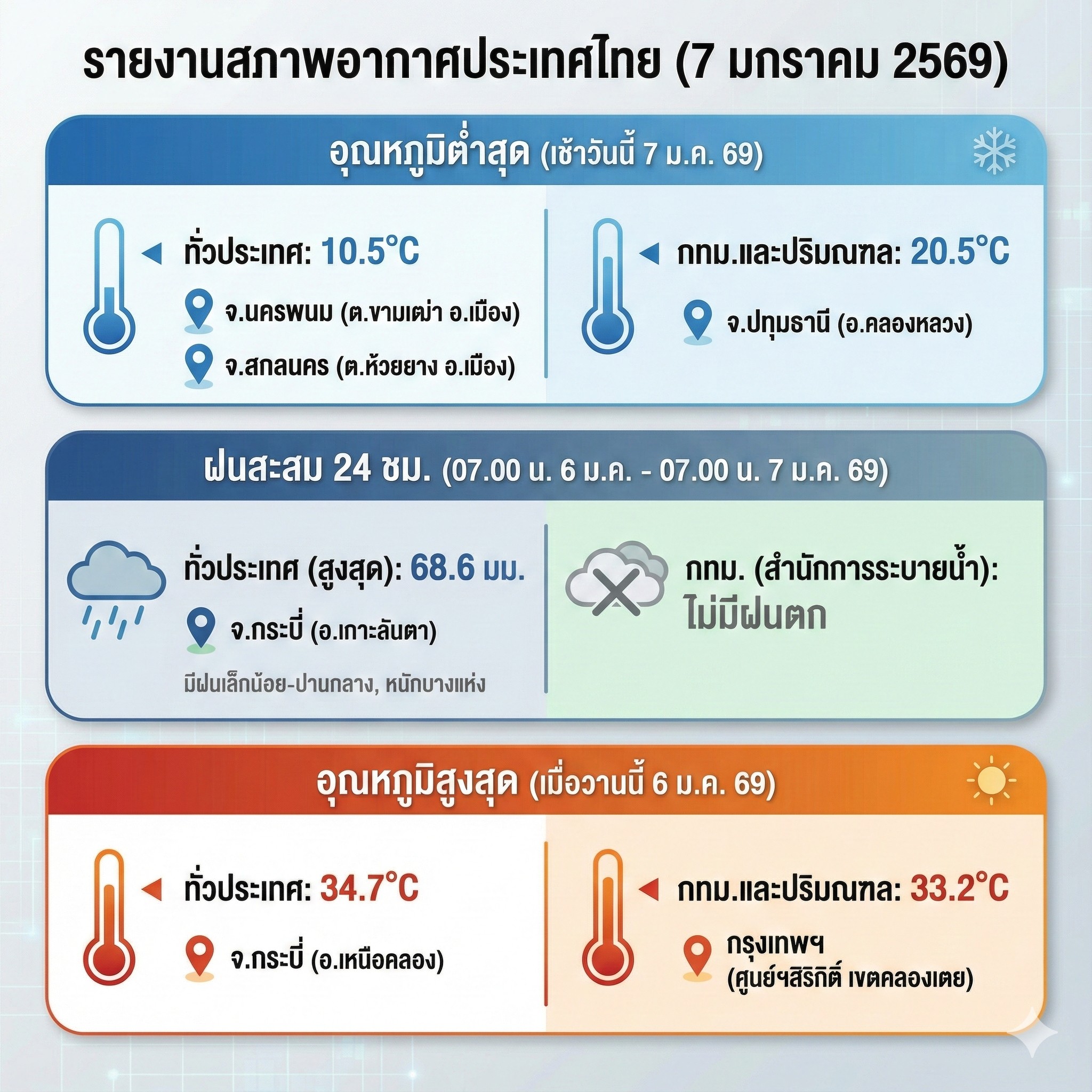 สรุปสภาพอากาศประจำวัน (7 ม.ค. 69) 🌤️❄️ อีสานยังหนาว 10.5 องศา! ส่วน กทม. เช้านี้แตะ 20 องศาครับ