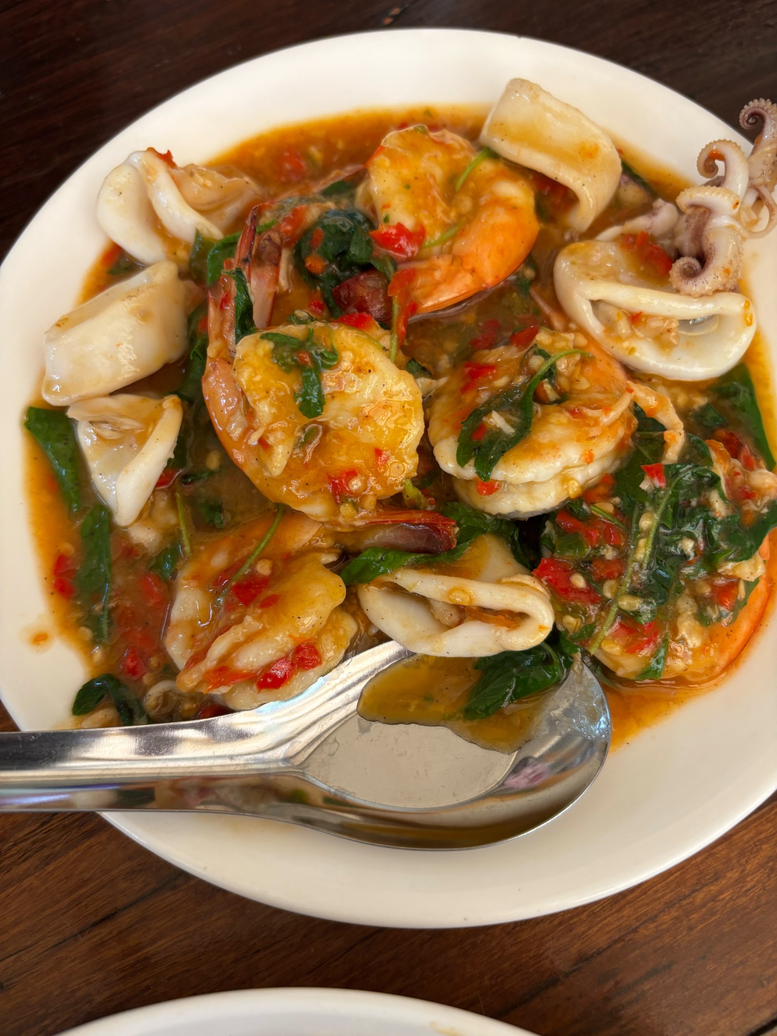 จานนี้ถือว่าเด็ด อร่อยทีเดียว เคี้ยวเพลิน ช่วยลดเผ็ดได้ จนต้องสั่งแบบผัดพริกแห้งกลับบ้านด้วย ก็ต้องบอกว่าผัดพริกแห้งยิ่งอร่อยกว่าอีก