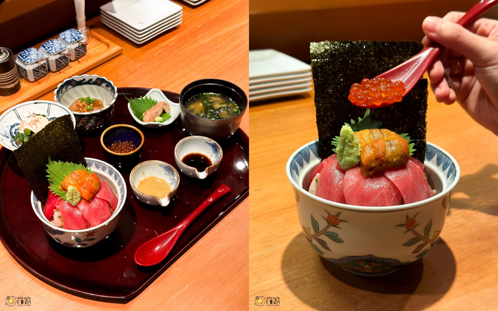 Don Omakase (2236net) เซตด้งพรีเมียมที่รวบรวมของดีไว้ในชามเดียว มีทั้งทูน่าสับ โอโทโร่ ท็อปด้วยอูนิหวานๆ และอิคุระแบบพูนชาม เสิร์ฟพร้อมเครื่องเคียงและซอส 2 สไตล์ (ครีมซีฟู้ด & โชยุบ๊วย) ปิดท้ายด้วยของหวานสุดละมุน