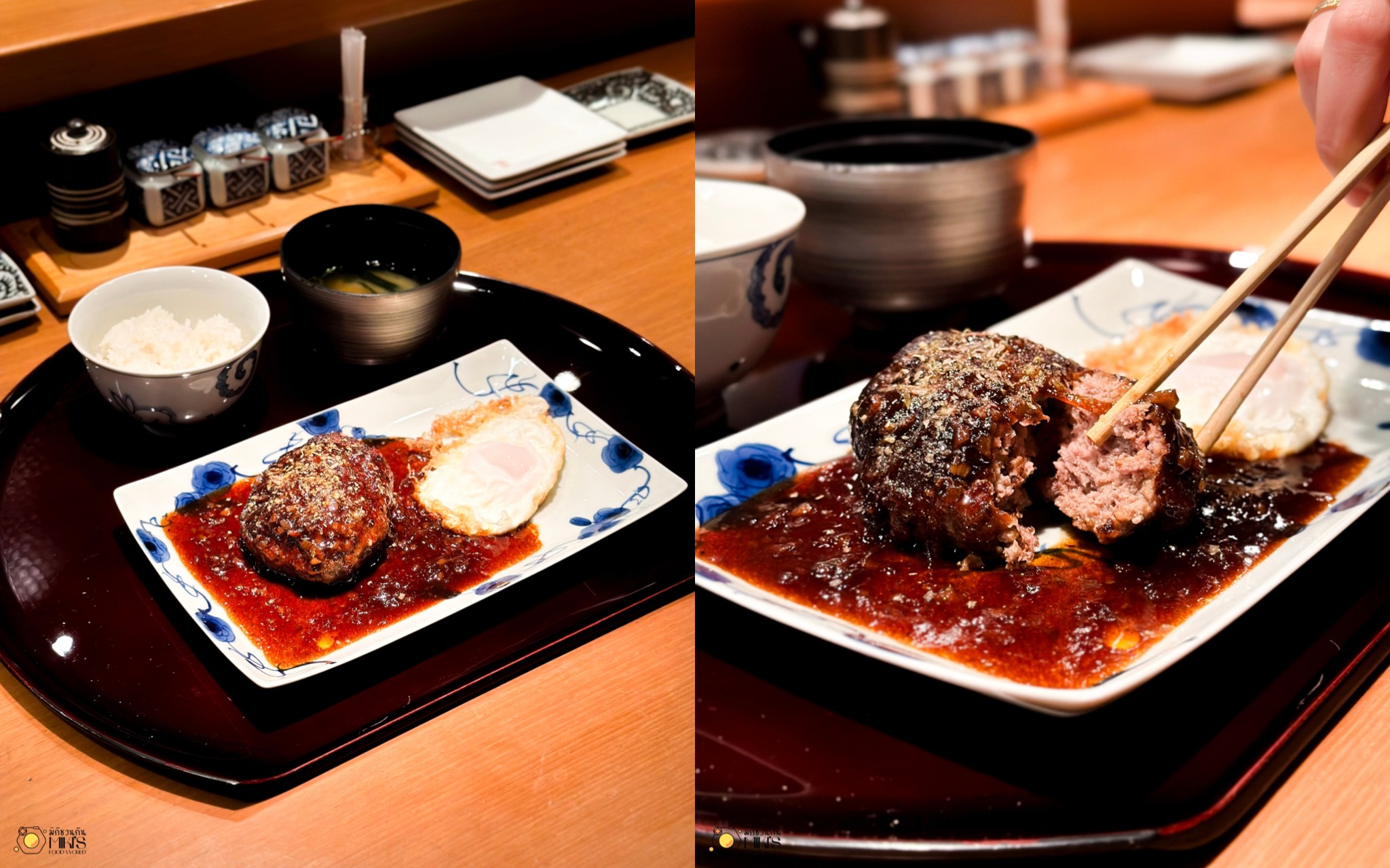 Hamburg Set (388net) แฮมเบิร์กโฮมเมดฝีมือเชฟทาคาชิ เนื้อนุ่มฉ่ำ ราดซอสสูตรพิเศษรสหวานเค็มลงตัว ท็อปด้วยไข่ดาวเยิ้มๆ ทานกับข้าวญี่ปุ่นร้อนๆ คือที่สุด