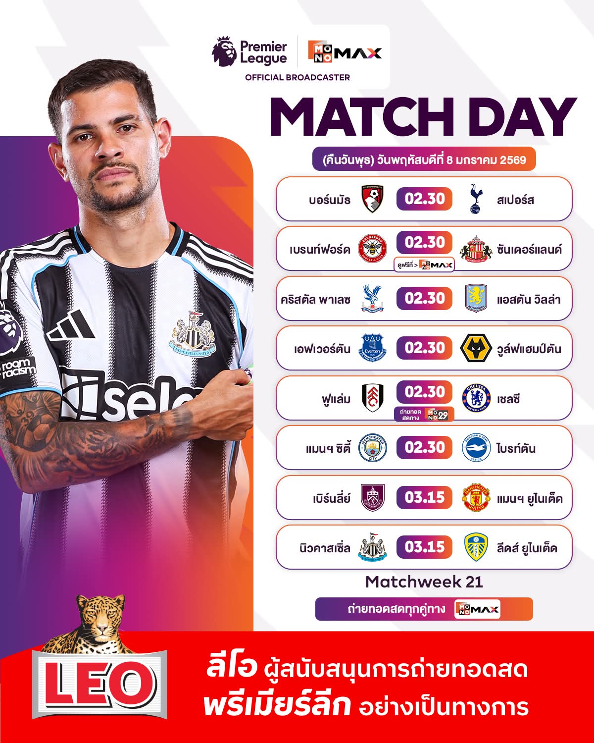 ⚽🏴| โปรแกรมพรีเมียร์ ลีก 2025/26 แมตช์ที่ 21 🗓️ วันพฤหัสบดี ที่ 8 มกราคม 2569 (คืนวันพุธ)