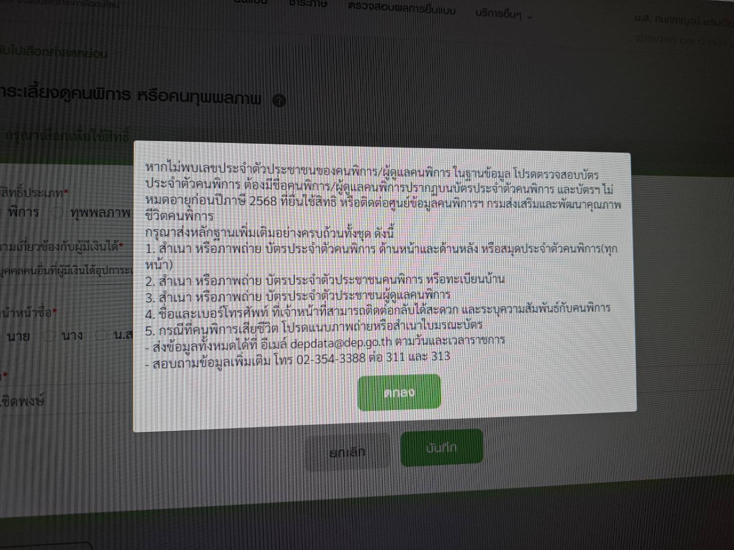 เรายื่นภาษี2568 ออนไลน์ แล้วตรงช่องกรอกลดหย่อนผู้ดูแลผู้พิการ เราก็ใส่ข้อมูลผู้พิการที่เราดูแล แต่ไม่สามารถบันทึกข้อมูลได้ ขึ้นมาแบบนี้เรากดตกลงแล้วแต่กดบันทึกข้อมูลไม่ได้ มันไม่บันทึก เพื่อนๆมีใครเป็นแบบเราบ้างไหม แล้วมีใครพอจะรุ้ไหมต้องทำยังไง