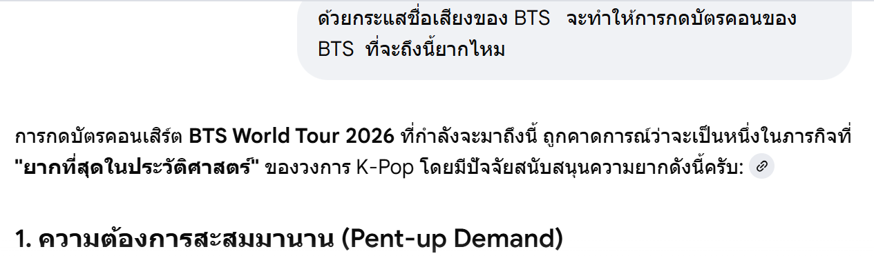 เมื่อฉันถามเอไอว่า "ด้วยกระแสชื่อเสียงของ BTS จะทำให้การกดบัตรคอนของ BTS ที่จะถึงนี้ยากไหม" คำตอบที่ได้ 😂😂😂
