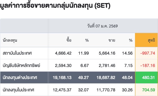 Sinthorn Summary 7/1/2569 : ต่างชาติซื้อสุทธิ 480.31 ลบ.