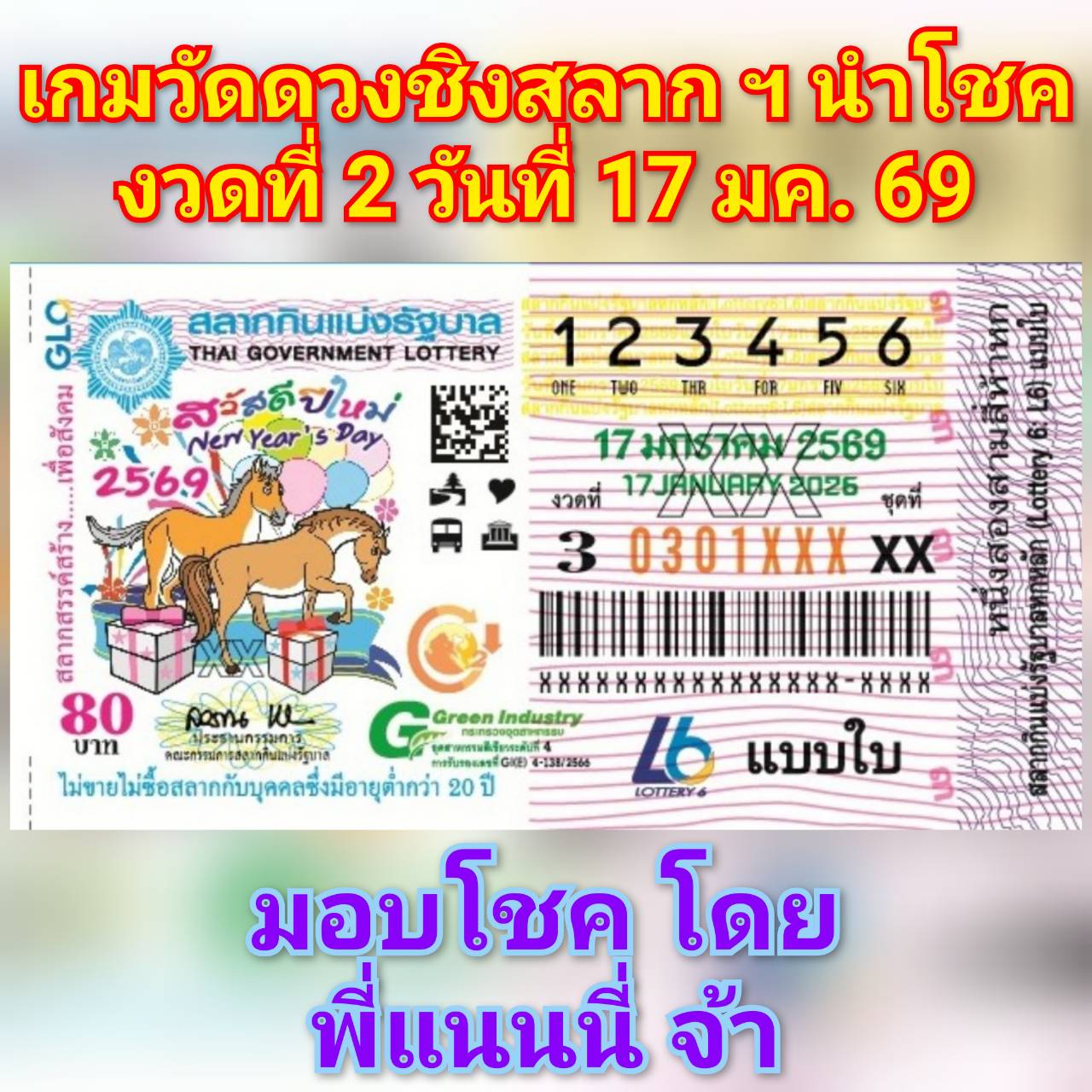 รางวัล :- สลาก ฯ นำโชค งวดที่ 2 วันที่ 17 มกราคม 2569 จำนวน 3 รางวัล ๆ ละ 3 ใบ และ กิตติมศักดิ์ 1 รางวัล คือ น้องซิน ( บ๊วยเถี่ยวฮวง) จ้า