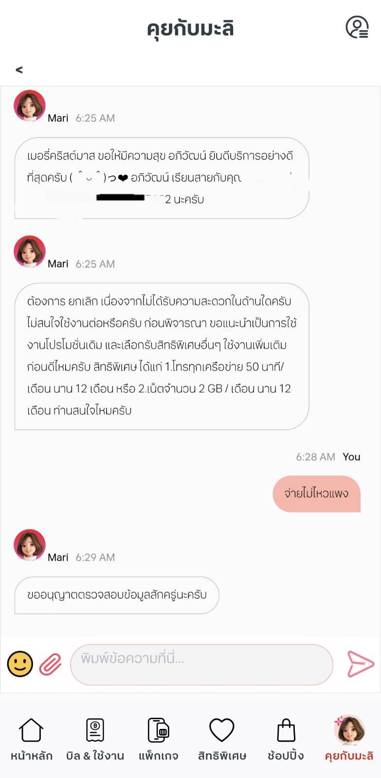 ต่อมาได้ติดต่อเจ้าหน้าที่เพื่อ เปลี่ยนแพ็กเกจเป็นรายเดือนราคา 350 บาท เนื่องจากต้องการควบคุมค่าใช้จ่าย