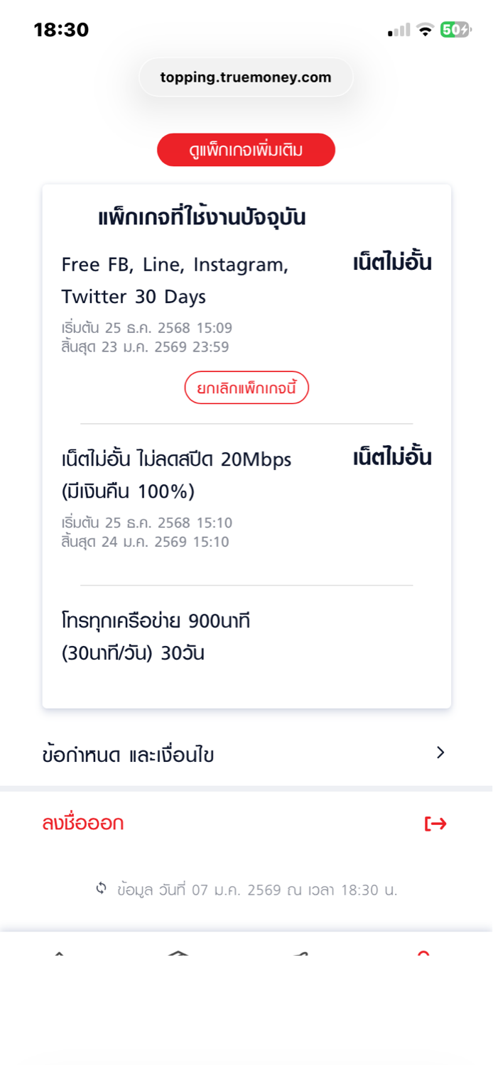 คือเราสมัครแพ็คเกจเน็ตไป จ่ายเงิน เงินออกจากบัญชีไปแล้ว 58.85 บาท แล้วทีนี้รอ sms แต่รอมาจะ 20 นาทีแล้วพอลองกด *900# ก็ไม่ได้รับ sms เข้าไปเช็คในแอป true ก็ไม่เจอแพ็คเกจอะไรเลย คือต้องดูอะไรตรงไหน หรื