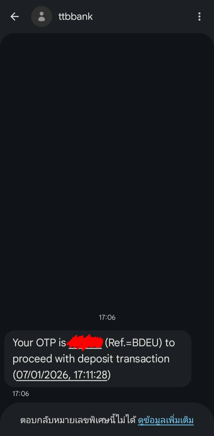 ผมเห็นรหัส OTP ถูกส่งมาใน SMS ที่มีชื่อว่า ttbbank ซึ่งผมไม่เคยใช้ธนาคารนี้เลย ไม่เคยเปิดบัญชี และไม่เคยโหลดแอป ttb มาในมือถือเลยครับ
