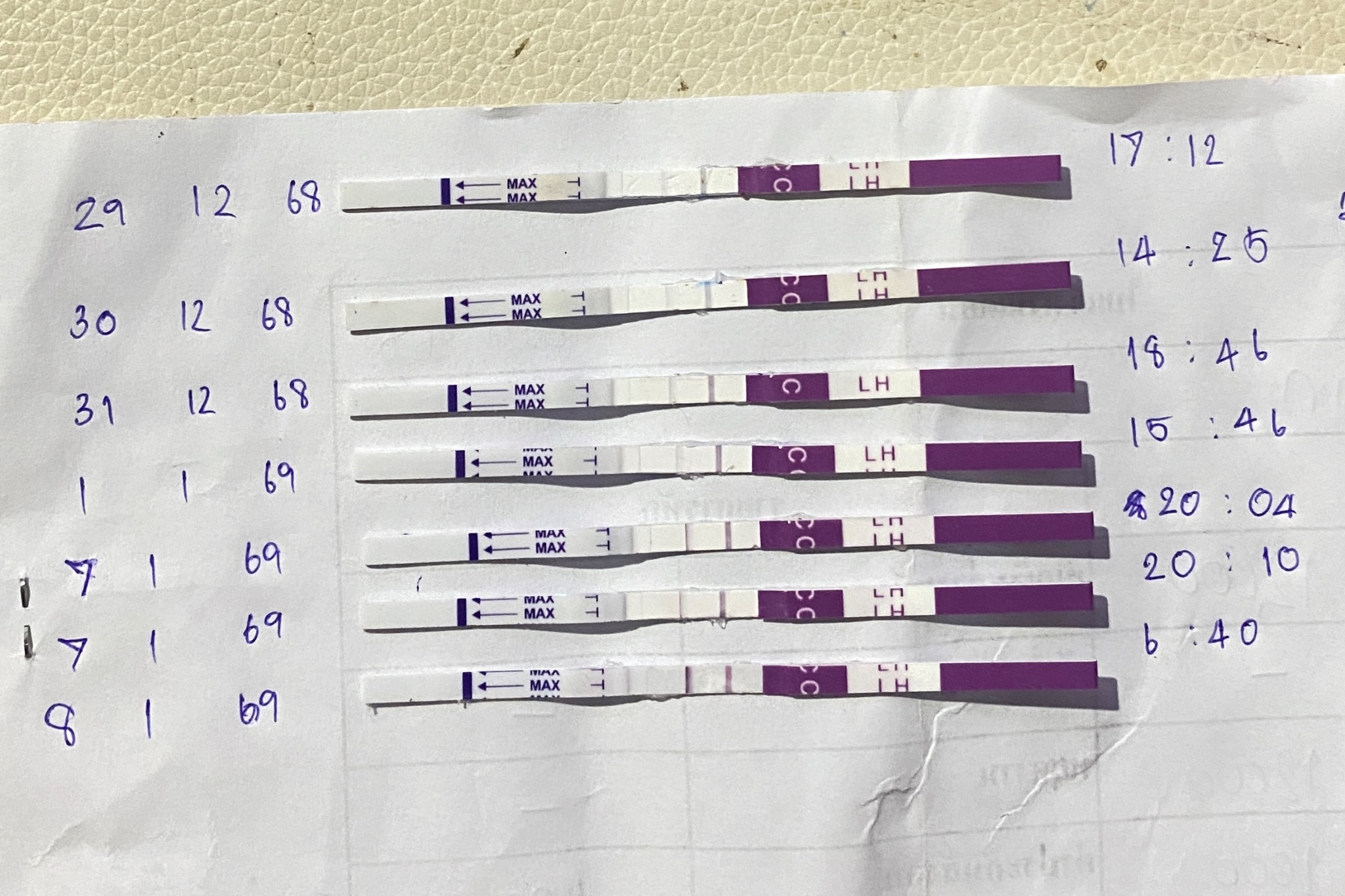 ดูวันตกไข่ในแอปบอกว่าจะตกไข่ประมาณช่วงวันที่29 แต่เราตรวจ+สังเกตอาการ ก็ยังไม่ใช่วันที่ไข่จะตกเลยลองตรวจดูเรื่อยๆ ผลก็เป็นลบ เราเลยลองหยุดตรวจไป แต่มาช่วงนี้รู้สึกตัวเองว่า อารมณ์ขึ้นๆลงๆ เบื่อๆ เซ็งๆ วันที่7เมื่อวานตอนเข้าห้องน้ำอยู่ สังเกตว่ามีเมือกใสๆ ก็เลยลองตรวจดูขึ้น2ขีด เเต่ไม่มั่นใจเลยตรวจใหม่อีกรอบ ก็ขึ้นแบบเดิม พอตื่นเช้ามาลองตรวจอีกรอบ ขึ้น2ขีดอยากทราบว่าไข่ตกเมื่อวาน วันนี้ หรือพรุ่งนี้หรอคะ #ตรวจใหม่ๆสีเข้มกว่าในรูปน่ะคะ