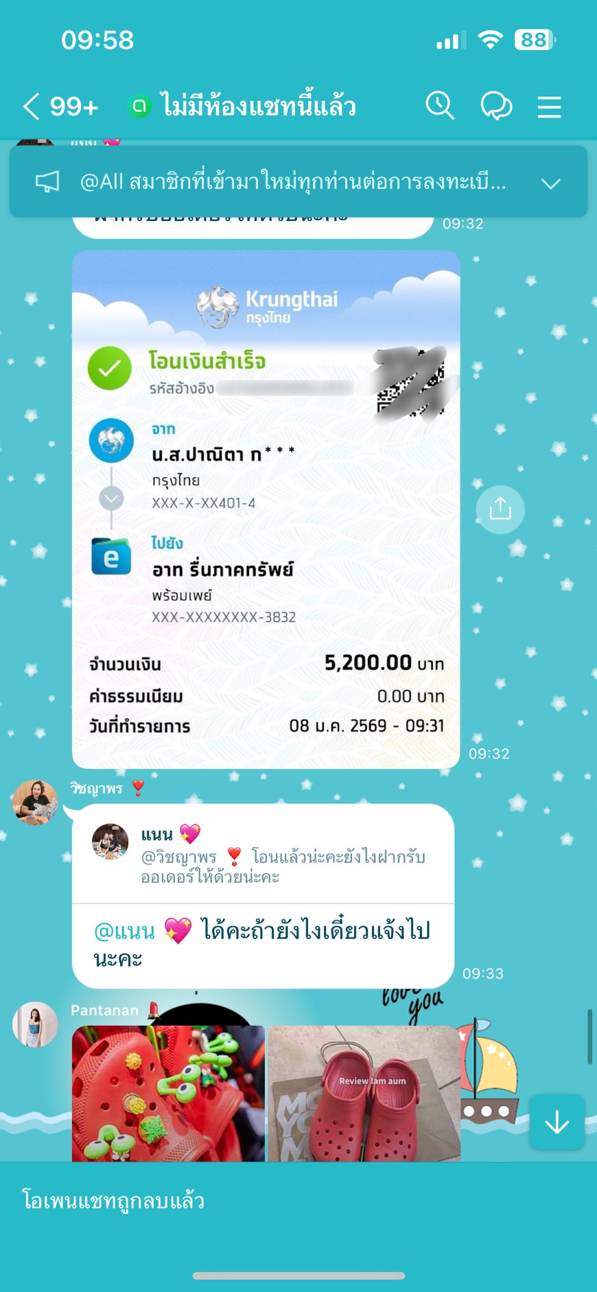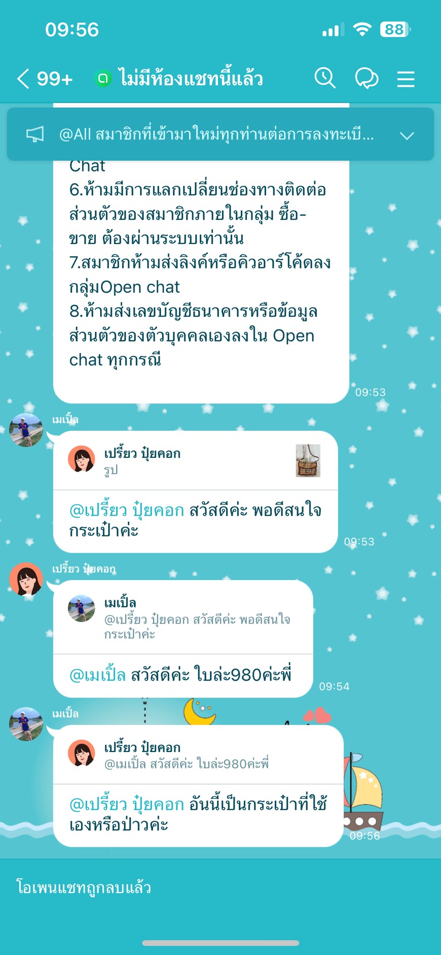 เขาทักเรามาใน แอพส้ม แล้วบอกอยากได้ออเดอร์ เยอะกว่านี้ ขอทักส่วนตัวมา ให้ไอดีแอพเขียวมา เราก็แอดไป เขาก็ให้เราส่งรูปสินค้าของเราที่มี ให้เขา แล้วเขาก็บอกให้ติดต่อลูกค้าเอง เขาก็ส่ง Openchat ให้เราเข้าไป ทีแรกก็งงๆ ว่าให้เข้ากลุ่มอะไร เราก็ทำตามเขา เพราะเราเองก็อยากได้ออเดอร์ พอตกลงจะสั่งซื้อ เขาก็ให้สมัครบัตรสมาชิกร้าน 165 บาท เราขอติดต่อส่วนตัวลูกค้า แอดมินเขาไม่ให้ เลยบอกไปว่างั้นไม่เป็นไร เราพิมพ์คำว่า ม.ิจ. ลงไปซักพัก ข้อความก็หายไปเลย โดนแล้วเรา หากินกับค่าสมัครง่ายๆ หรอ ดีนะไม่โอน สุดท้ายลบเราออกจากกลุ่มทันที