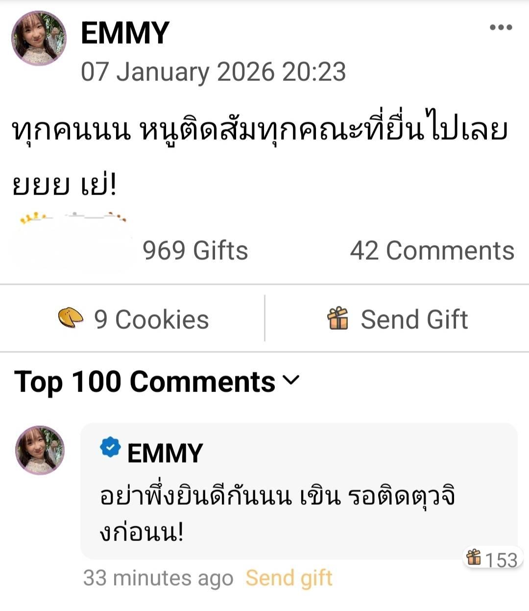 เอ็มมี่ บอกว่าพี่เฌอปราง ทักมาวันศุกร์ที่แล้ว ตอน 8 โมงเช้า เฌอปราง: ยินดีด้วยนะ ผ่าน ม. ที่ยื่นไปเลย เก่งมากๆ เห็นอัพเดทของเอ็มมี่แล้ว อยากมาแสดงความยินดีในทุกๆเรื่องเลย ภูมิใจจัง น้องเราเก่ง พี่เฌ