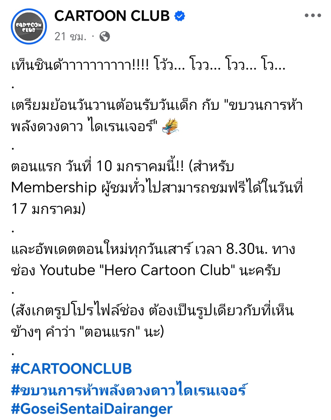 ล่าสุดทาง cartoon club ประกาศแล้วว่า เตรียมดูไดเรนเจอร์แบบถูกลิขสิทธิ์ บน youtube ชื่อ hero cartoon club (sentai cartoon club เดิม) 10 ม.ค. 69 ครับ