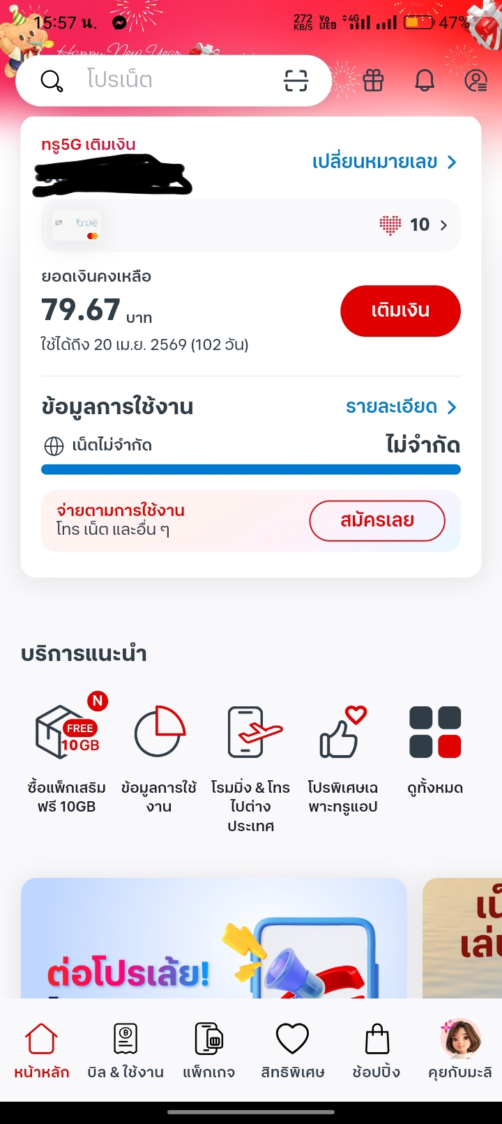 true ไม่หักแพ็กเกจเสริม และหักเงินค่าอินเตอร์เน็ทเรื่อยๆ