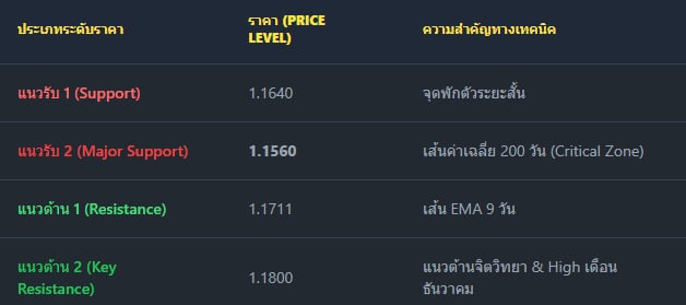 หากแนวรับนี้รับไม่อยู่ เราอาจเห็นการเทขายรุนแรง (Panic Sell) ลงไปทดสอบเส้นค่าเฉลี่ย 200 วัน (SMA) ที่บริเวณ 1.1560 ได้ ซึ่งจะเป็นจุดเปลี่ยนแนวโน้มระยะยาวที่สำคัญมาก