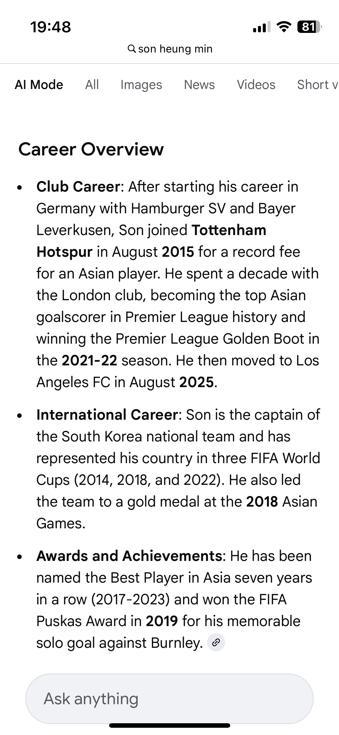 อยากทราบว่า Son Heung Min คือนักฟุตบอลเชื้อสายเอเชียที่เก่งที่สุดในประวัติศาสตร์ใช่หรือไม่ครับ เพื่อนๆพอจะมีความเห็นเป็นอย่างไร เชิญมาบอกกล่าวได้เลยครับ (เหมือนเขาจะเคยลงแข่งในโอลิมปิกปี 2016 ที่บราซิลเป็นเจ้าภาพด้วยนะครับ 😅)