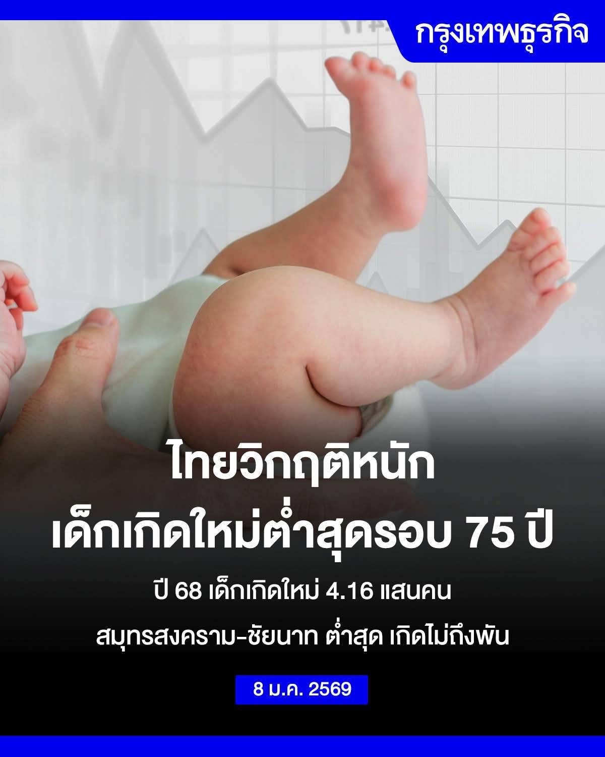 👨👩👧ไทยวิกฤติหนัก เด็กเกิดใหม่ต่ำสุดรอบ 75 ปี ปี 68 เด็กเกิดใหม่ 4.16 แสนคน สมุทรสงคราม-ชัยนาท ต่ำสุด เกิดไม่ถึงพัน