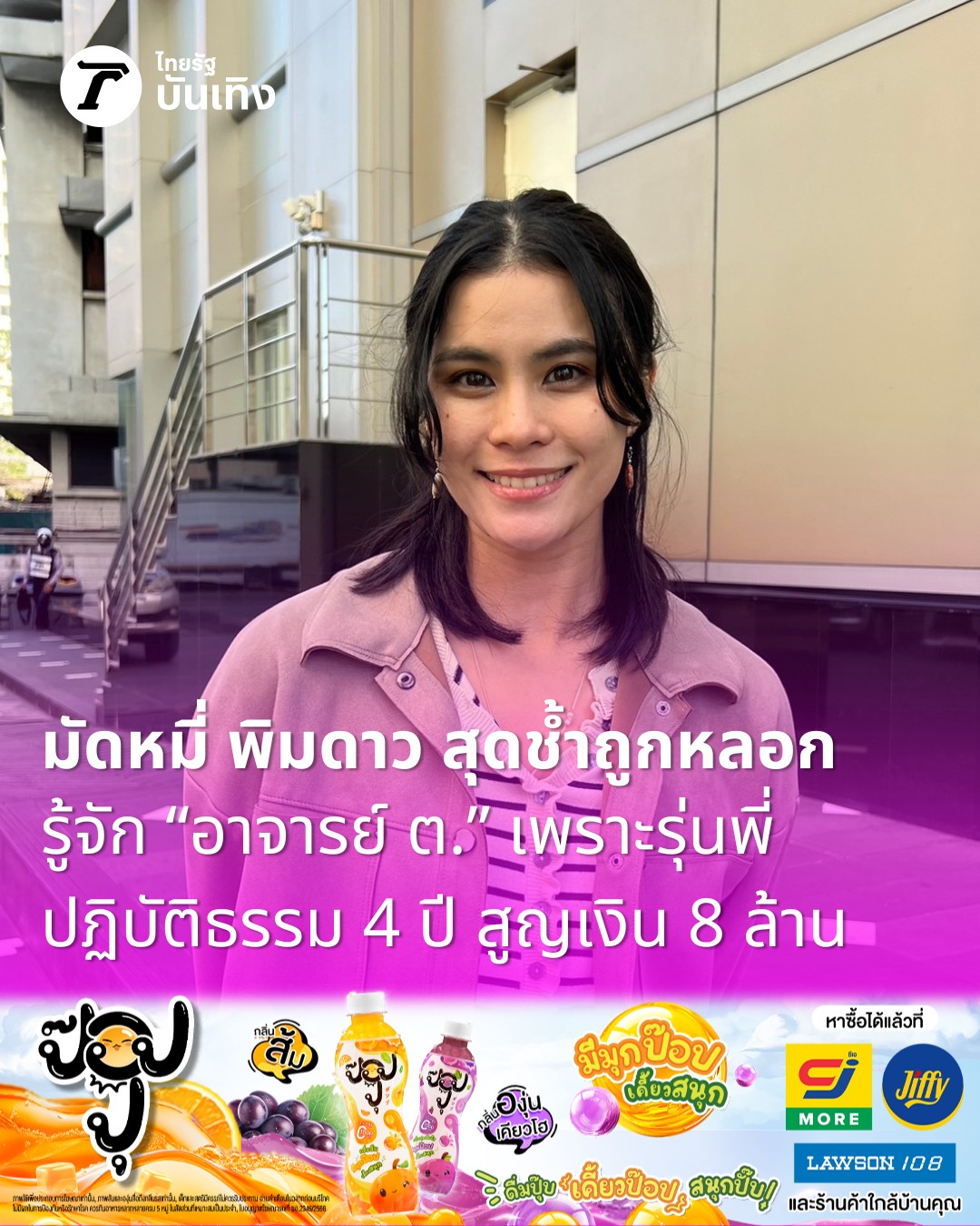 - ก่อนหน้านี้ มัดหมี่ พิมดาว ได้ออกมาแบ่งปันเรื่องราวของตัวเอง ที่ได้ไปปฏิบัติธรรมกับ อาจารย์ ต. ถึง 4 ปี กว่าจะรู้ตัวโดนหลอกก็ทำสูญเงินไป 8 ล้าน