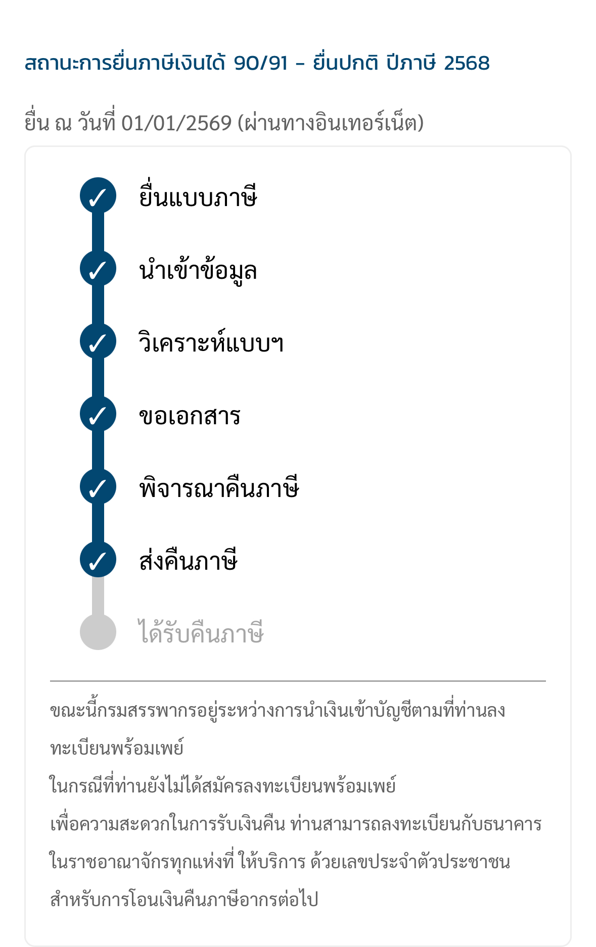 สถานะยื่นขอคืนภาษียื่นวันที่2/1/26 จนวันที่ 8/1/26 สถานะไม่ขยับ แต่พอวันที่9/1/26 มาถึง ส่งคืนภาษี แล้วต้องรออีกนานมั้ยกว่าจะได้เงิน