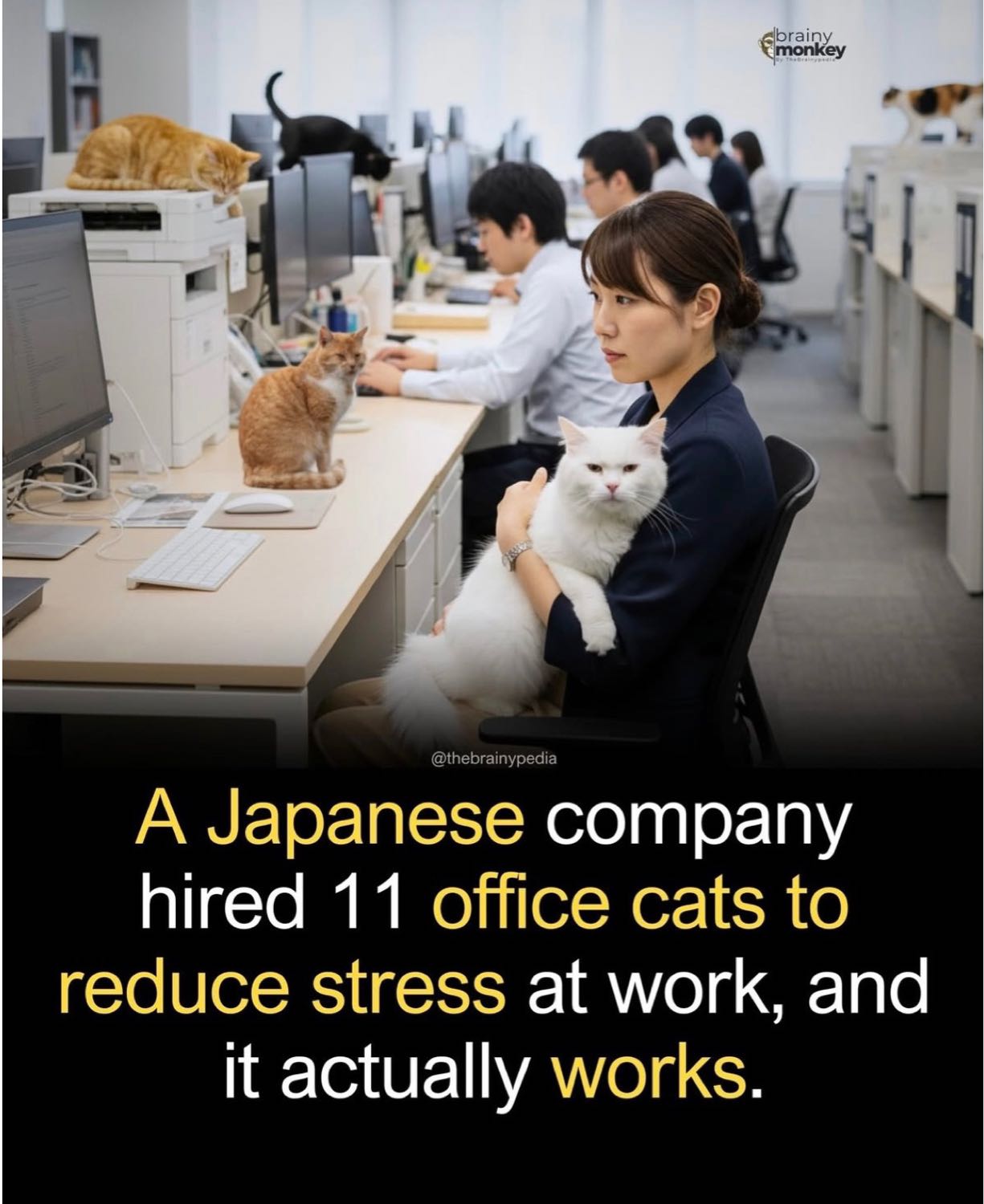Qnote Inc. บริษัทเทคโนโลยีในกรุงโตเกียว ประเทศญี่ปุ่น ได้ค้นพบวิธีที่ไม่เหมือนใครในการลดความเครียดในที่ทำงานด้วยการ "จ้างแมว" ข้อมูลจาก South China Morning Post ระบุว่าบริษัทได้รับเลี้ยงแมวตัวแรกในปี 2004 และค่อยๆ เพิ่มจำนวนขึ้นจนปัจจุบันมีแมวอาศัยอยู่ในออฟฟิศแบบเต็มเวลาถึง 11 ตัว