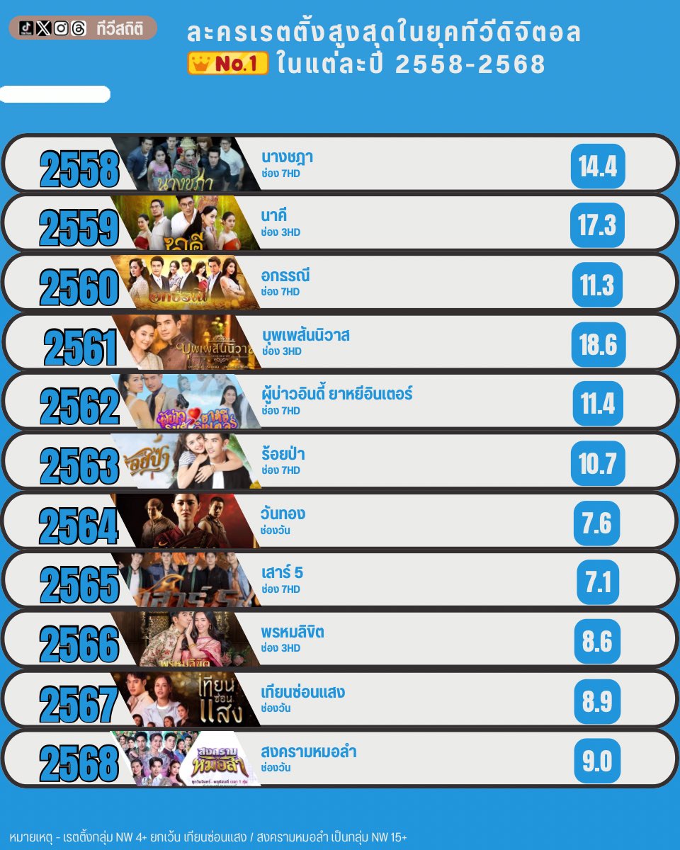 1 อกธรณี 11.3 ช่อง7 2 เกิดเป็นกา 10.5 ช่อง7 3 เพลิงพระนาง 9.0 ช่อง7 4 คู่ซ่ารสเเซ่บ 8.8 ช่อง7 5 มือปราบเจ้าหัวใจ 8.7 ช่อง7 เพลิงบุญ 8.66
