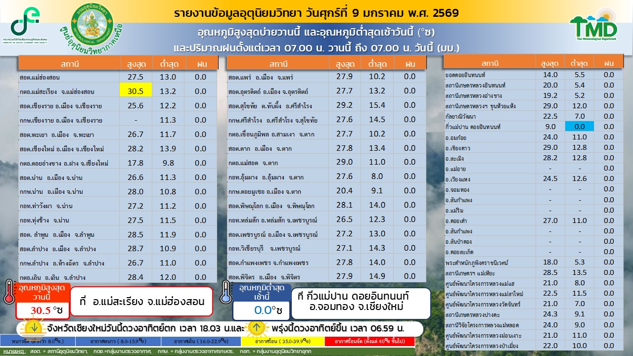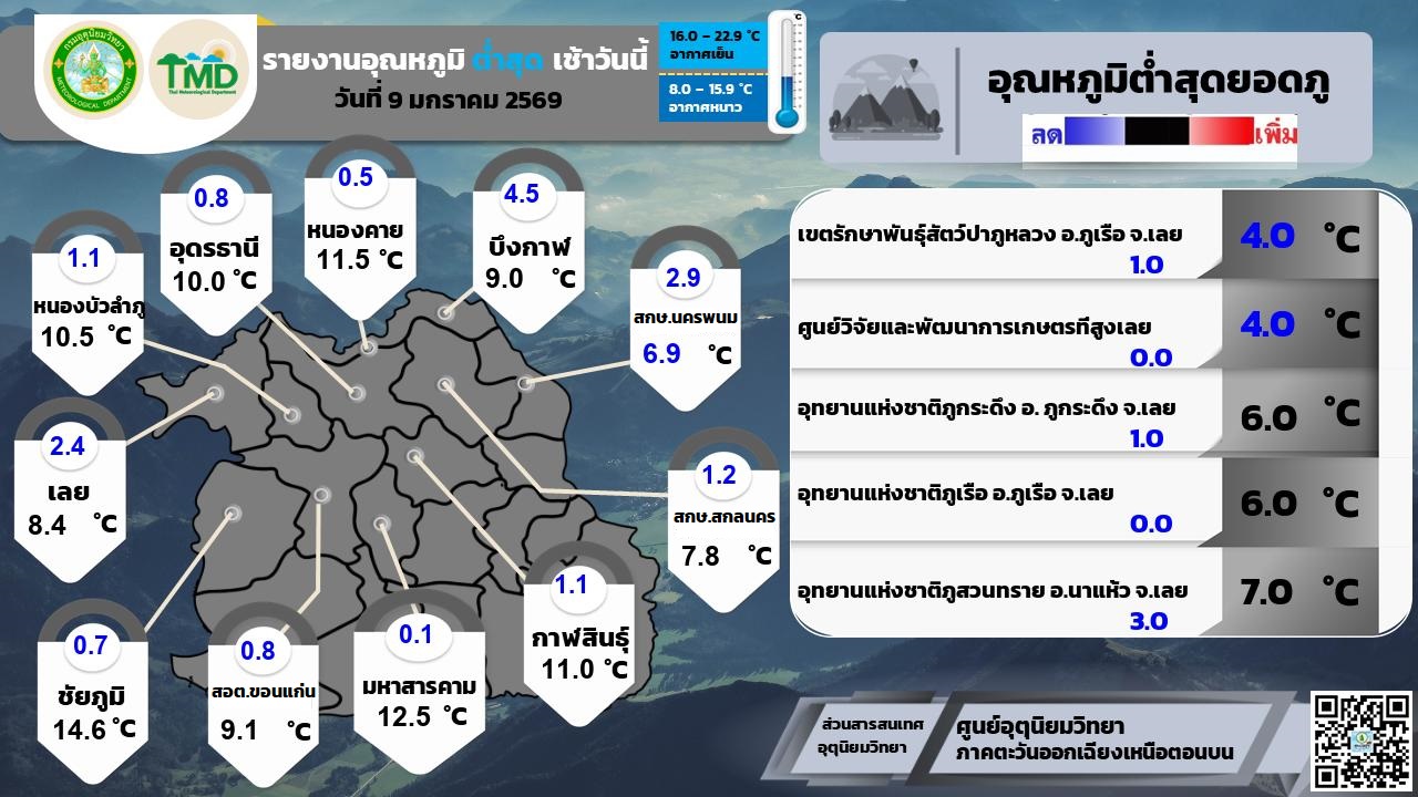 สวัสดีครับเพื่อนๆ สมาชิกชาวพันทิปทุกคน เช้านี้อากาศหลายพื้นที่ยังคงเย็นสบาย โดยเฉพาะทางภาคอีสานครับ ผมรวบรวมข้อมูลอุณหภูมิสูงสุด-ต่ำสุด และปริมาณฝนประจำวันมาฝากกันครับ ❄️ อุณหภูมิต่ำสุดเช้านี้ (7 ม.ค.