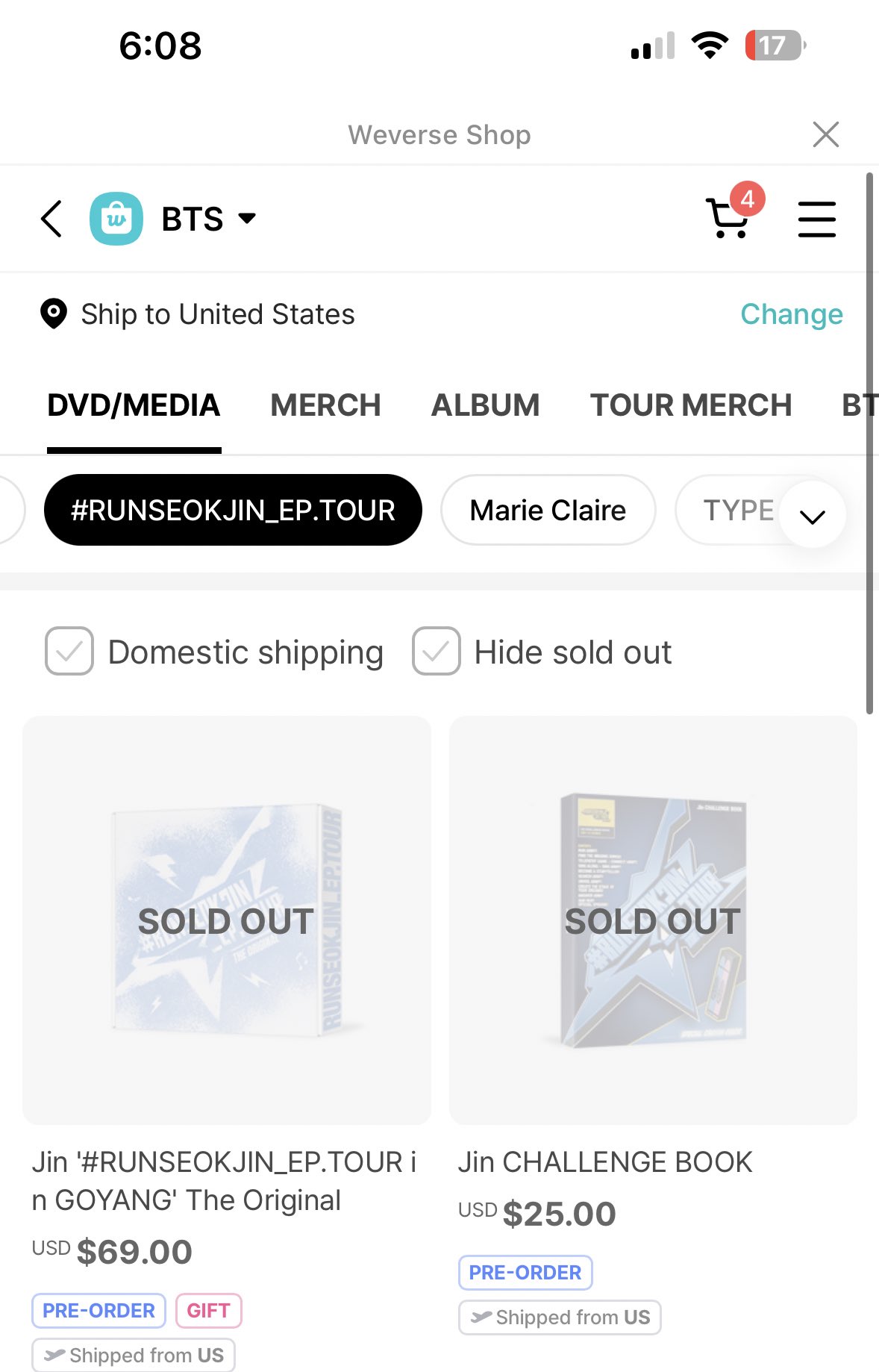 "King of Sold Out" อีกคนของบังทันเมื่อ จิน ประกาศพรีออเดอร์ CHALLENGE BOOK และบันทึกคอนเสิร์ต RUNSEOKJIN_EP.TOUR in GOYANG the Original ทันทีที่วางขาย ก็ Sold Out บน Weverse Shop สหรัฐอเมริกา ภายในเวลาเพียง 7 นาที เท่านั้น