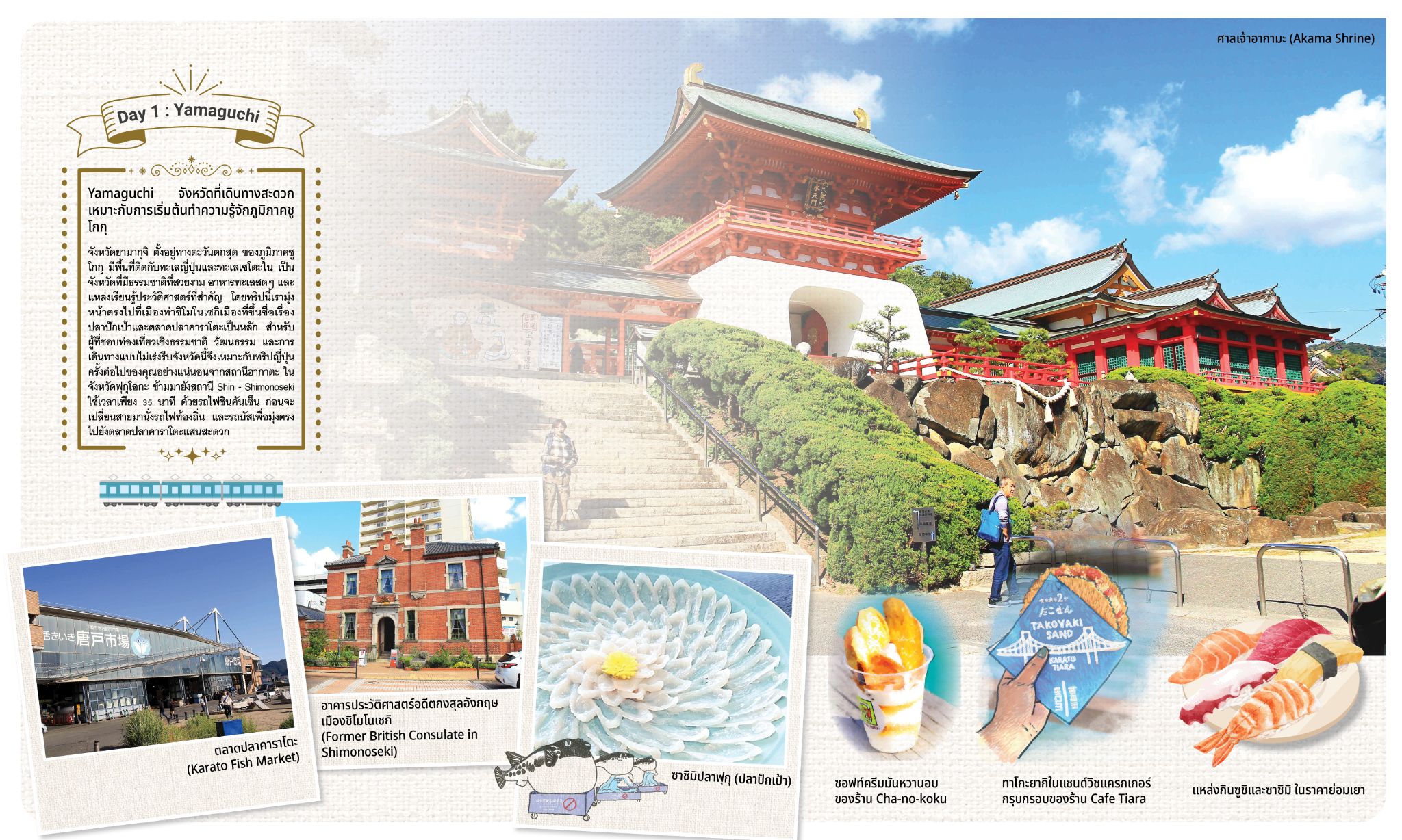 จังหวัดยามากุจิ ตั้งอยู่ทางตะวันตกสุดของภูมิภาคชูโกกุ ติดทะเลญี่ปุ่นและทะเลเซโตะใน เป็นจังหวัดที่มีธรรมชาติที่สวยงาม อาหารทะเลสดๆ และแหล่งเรียนรู้ประวัติศาสตร์สำคัญจำนวนมาก โดยทริปนี้เราเน้นไปที่เมืองท่าชิโมโนเซกิ ที่ขึ้นชื่อเรื่องปลาปักเป้าและตลาดปลาคาราโตะเป็นหลัก สำหรับผู้ที่ชอบท่องเที่ยวเชิงธรรมชาติ วัฒนธรรม และการเดินทางแบบไม่เร่งรีบ จังหวัดนี้เหมาะกับทริปญี่ปุ่นครั้งต่อไปของคุณอย่างแน่นอน โดยจากสถานีฮากาตะในจังหวัดฟุกุโอกะ ข้ามมายังสถานี Shin- Shimonoseki ในจังหวัดยามากุจิ ใช้เวลาเพียง 35 นาที ด้วยรถไฟชินคันเซ็น ก่อนจะเปลี่ยนสายมานั่งรถไฟท้องถิ่น และรถบัสเพื่อมุ่งตรงไปยังตลาดปลาคาราโตะแสนสะดวก