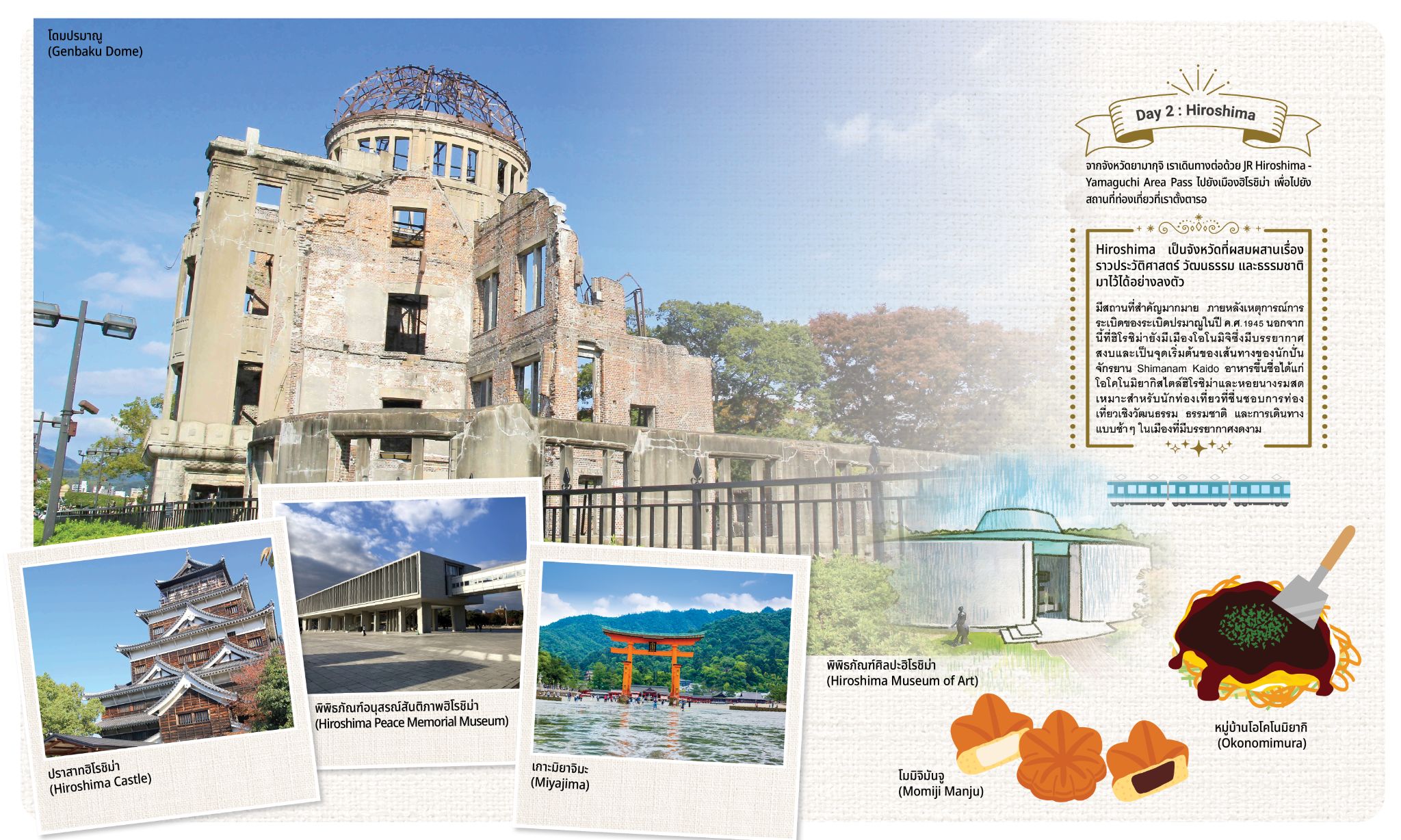 Hiroshima เป็นจังหวัดที่ผสมผสานประวัติศาสตร์ วัฒนธรรม และธรรมชาติได้อย่างลงตัว มีสถานที่สำคัญมากมาย ภายหลังเหตุการณ์การระเบิดของระเบิดปรมาณูในปี ค.ศ.1945 นอกจากนี้ยังมีเมืองโอโนมิจิซึ่งมีบรรยากาศสงบและเป็นจุดเริ่มต้นของเส้นทางปั่นจักรยาน Shimanami Kaido อาหารขึ้นชื่อได้แก่โอโคโนมิยากิสไตล์ฮิโรชิม่าและหอยนางรมสด เหมาะสำหรับนักท่องเที่ยวที่ชื่นชอบการท่องเที่ยวเชิงวัฒนธรรม ธรรมชาติ และการเดินทางแบบช้าๆ ในเมืองที่มีบรรยากาศงดงาม