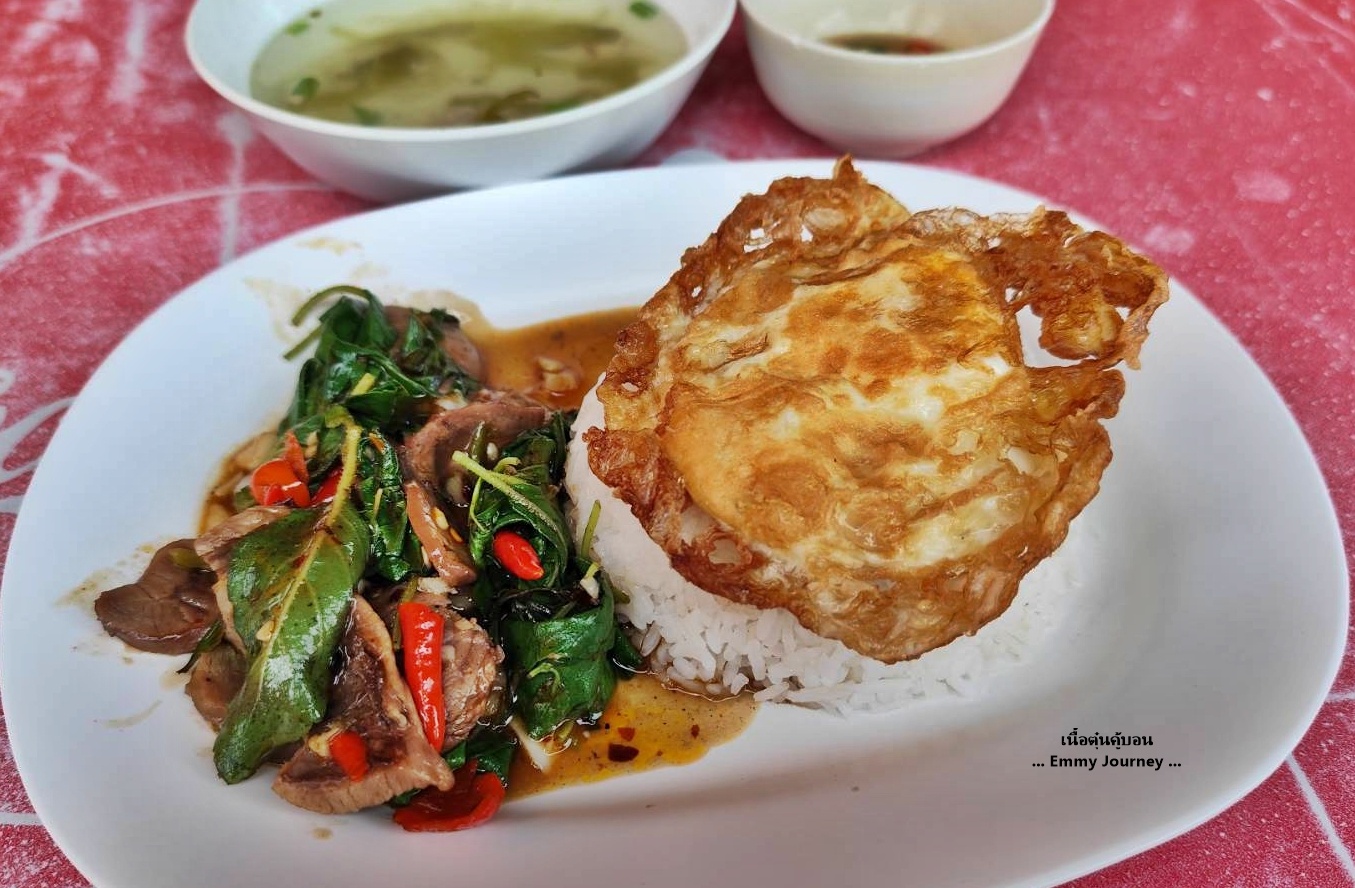 กะเพราเนื้อตุ๋น ไข่ดาว (ไข่ดาวฟองละ 10 บาท ) ราคา 110 บาท (เราว่าแพงไป) รสชาติกะเพราออกหวานนำ
