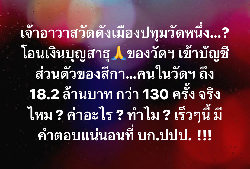 เจ้าอาวาสวัดดังเมืองปทุมวัดหนึ่ง…? โอนเงินบุญสาธุ🙏ของวัดฯ เข้าบัญชีส่วนตัวของสีกา…คนในวัดฯ ถึง 18.2 ล้านบาท กว่า 130 ครั้ง จริงไหม ? ค่าอะไร ? ทำไม ? เร็วๆนี้ มีคำตอบแน่นอนที่ บก.ปปป. !!!