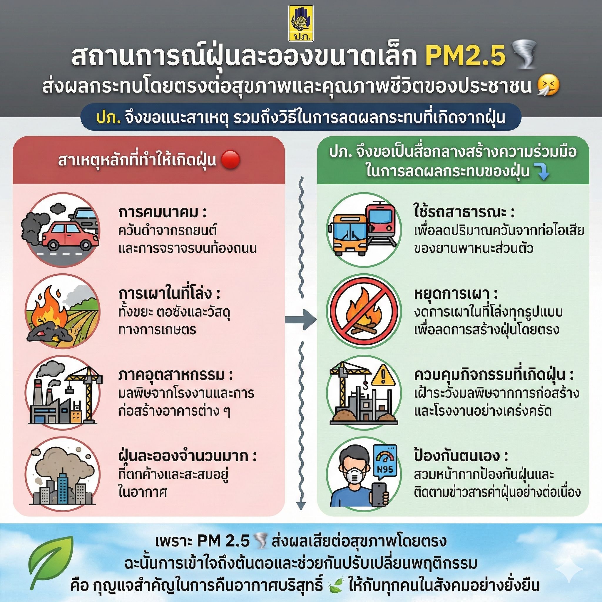 ฝุ่นจิ๋วพวกนี้ส่งผลกระทบโดยตรงต่อสุขภาพและคุณภาพชีวิตของเราจริงๆ ครับ วันนี้ผมเลยอยากมาแชร์ข้อมูลดีๆ จาก กรมป้องกันและบรรเทาสาธารณภัย (ปภ.) ที่ทำ Infographic สรุปสาเหตุและแนวทางการลดผลกระทบไว้ได้เข้าใจง่ายมากๆ ครับ