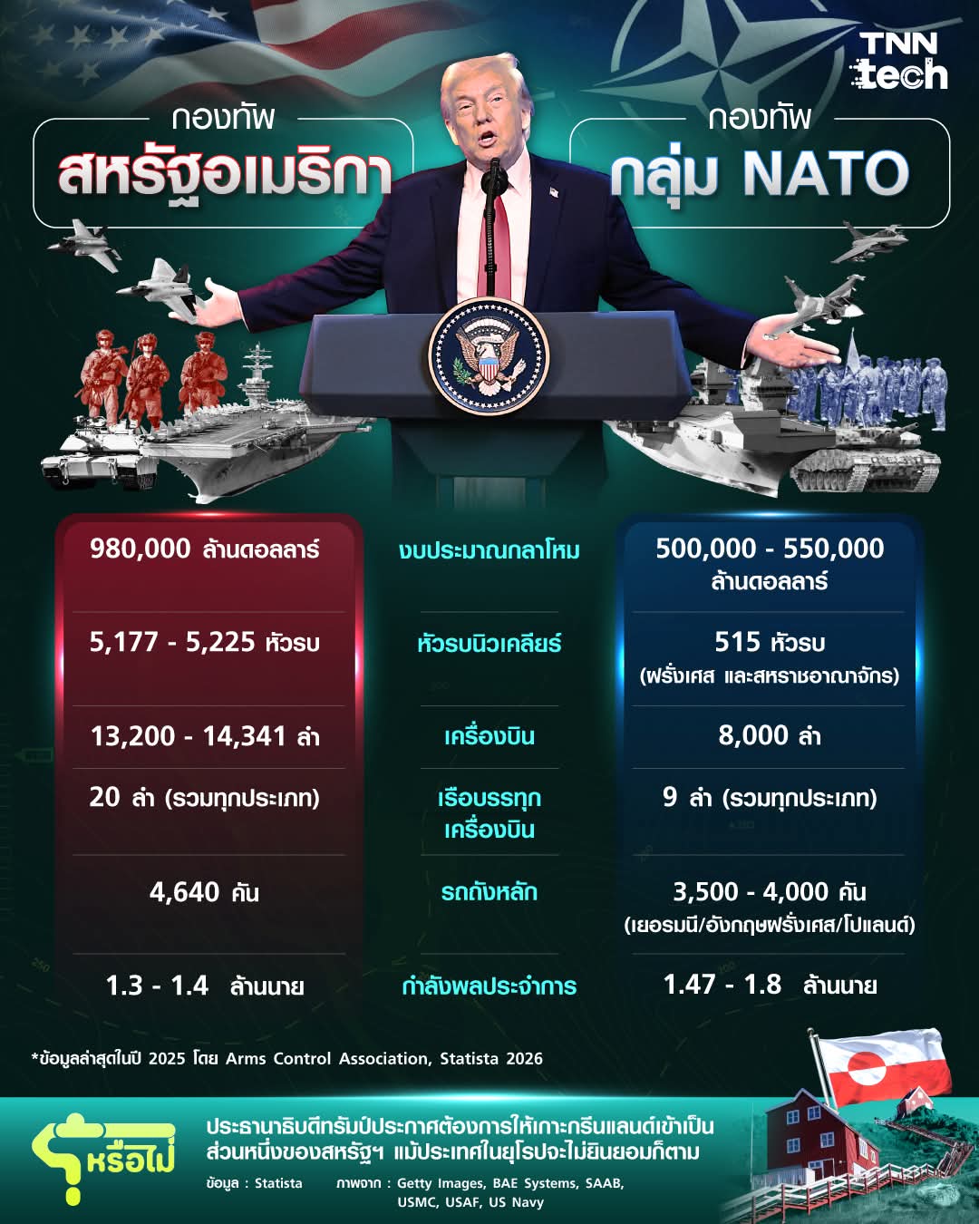 ในเวทีความมั่นคงโลก สหรัฐอเมริกา ยังคงเป็นประเทศที่มีกำลังทหารแข็งแกร่งที่สุดในโลกอย่างไร้ข้อกังขา แต่เมื่อพิจารณาเปรียบเทียบกับ กลุ่มประเทศ NATO โดยไม่รวมสหรัฐฯ ตัวเลขหลายด้านสะท้อนให้เห็นภาพที่ซับซ้อนกว่าคำว่ามหาอำนาจเดี่ยว และอธิบายได้ว่าทำไมประเด็นทางภูมิรัฐศาสตร์อย่าง กรีนแลนด์ จึงกลายเป็นหมากสำคัญบนกระดานโลก