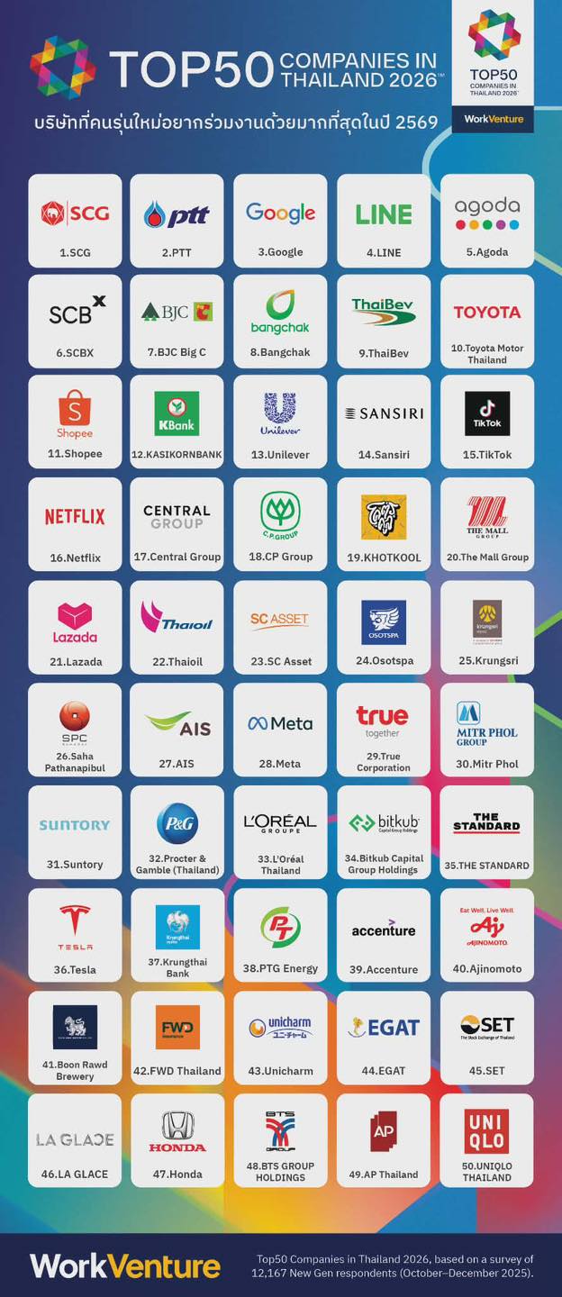 สรุป Top 50 Companies in Thailand 2026 บริษัทที่คนรุ่นใหม่อยากร่วมงานด้วยมากที่สุดประจำปี 2026 ดังนี้