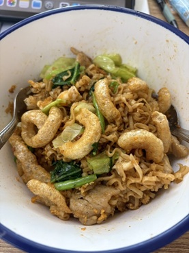 แล้วอาหารมื้อบ่าย แม่ก็ทำเป็นมาม่าผัดไข่ให้ ใส่ชามพร้อม