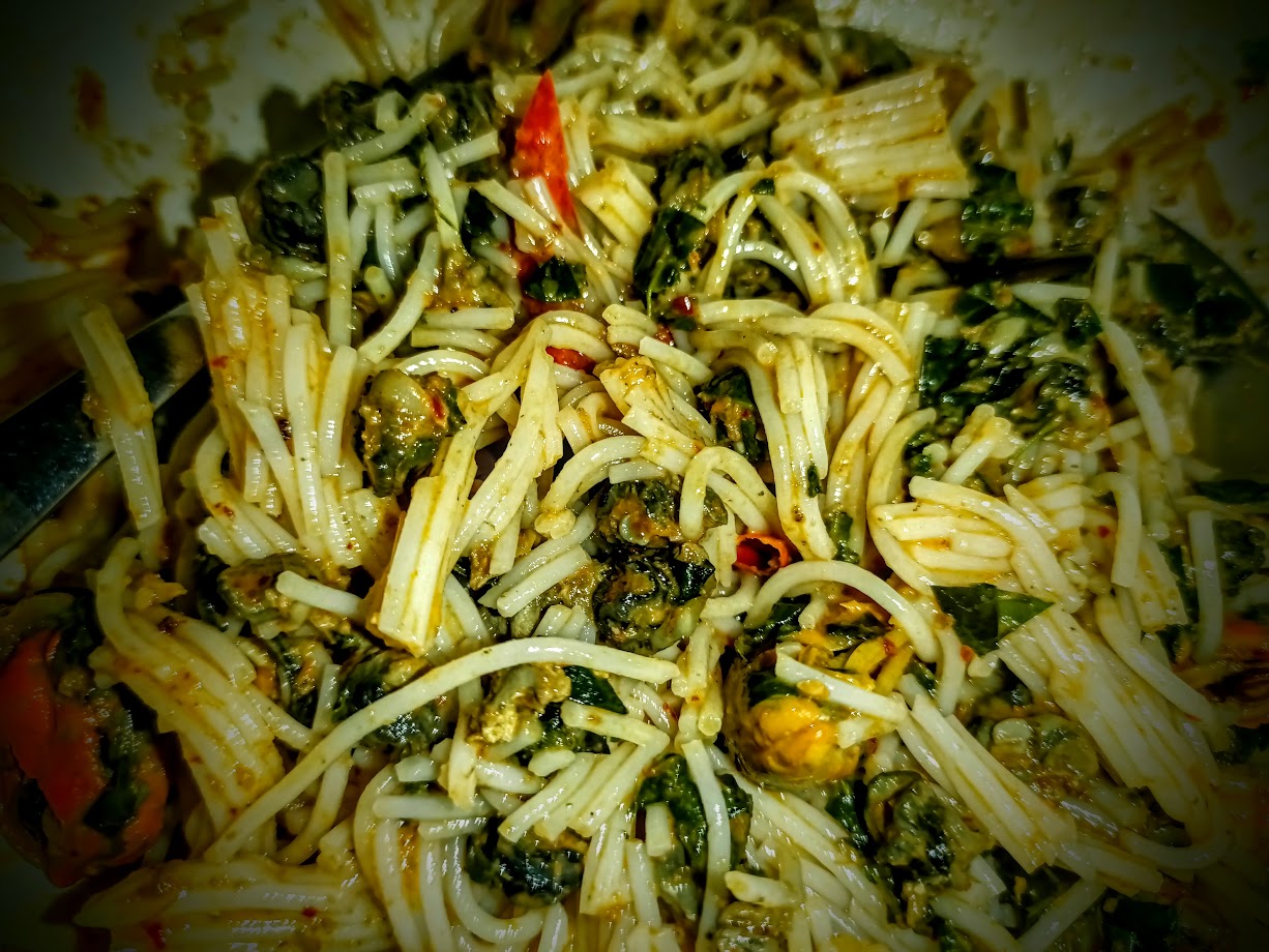 วิธีทำให้เส้นขนมจีนที่แช่ไว้ในตู้เย็นนิ่มลง - แกงคั่วหอยขม หอยแมลงภู่ ใบชะพลู/สัปปะรส อีกครั้ง