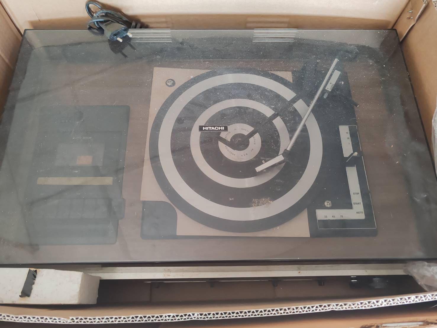 The item shown on the box is a Hitachi Music Centre model SS-6271, a vintage all-in-one stereo system from the late 1970s or early 1980s. These systems typically integrated a turntable, AM/FM stereo radio tuner, and a cassette deck into a single console, sometimes including a pair of matching speakers.