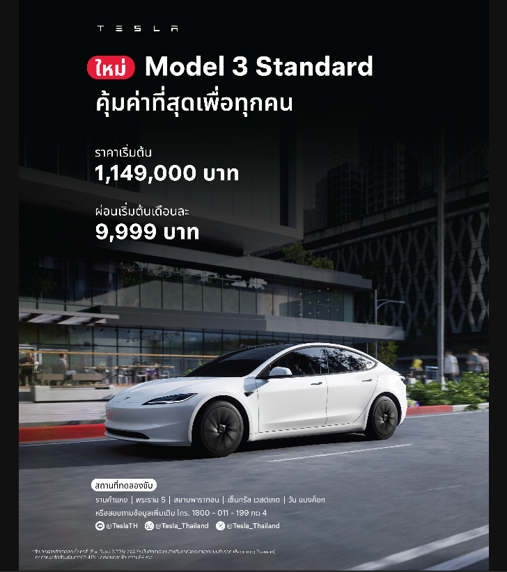 Tesla Model 3 Standard (รุ่นเริ่มต้นที่คุ้มค่าที่สุด) รุ่นนี้ถูกออกแบบมาเพื่อเป็น "Tesla ที่เข้าถึงง่ายที่สุด" สำหรับคนไทย โดยมีการปรับสเปกบางส่วนเพื่อให้ทำราคาได้ต่ำลงแต่ยังคงสมรรถนะที่เป็นเอกลักษณ์ ราคาเริ่มต้น: 1,149,000 บาท โปรโมชันผ่อน: เริ่มต้นเพียง 9,999 บาท/เดือน ระยะทางการวิ่ง: สูงสุด 534 กม. (มาตรฐาน WLTP) ต่อการชาร์จหนึ่งครั้ง ระบบขับเคลื่อน: ล้อหลัง (Rear-Wheel Drive) ไฮไลต์การชาร์จ: รองรับ Supercharger 175 kW ชาร์จเพียง 15 นาที วิ่งต่อได้ถึง 270 กม. ดีไซน์และออปชัน: ล้อลาย Prismata ขนาด 18 นิ้ว ภายในตกแต่งสีดำล้วน (All Black) รองรับระบบ Autopilot และการอัปเดตซอฟต์แวร์ผ่านอากาศ (OTA)