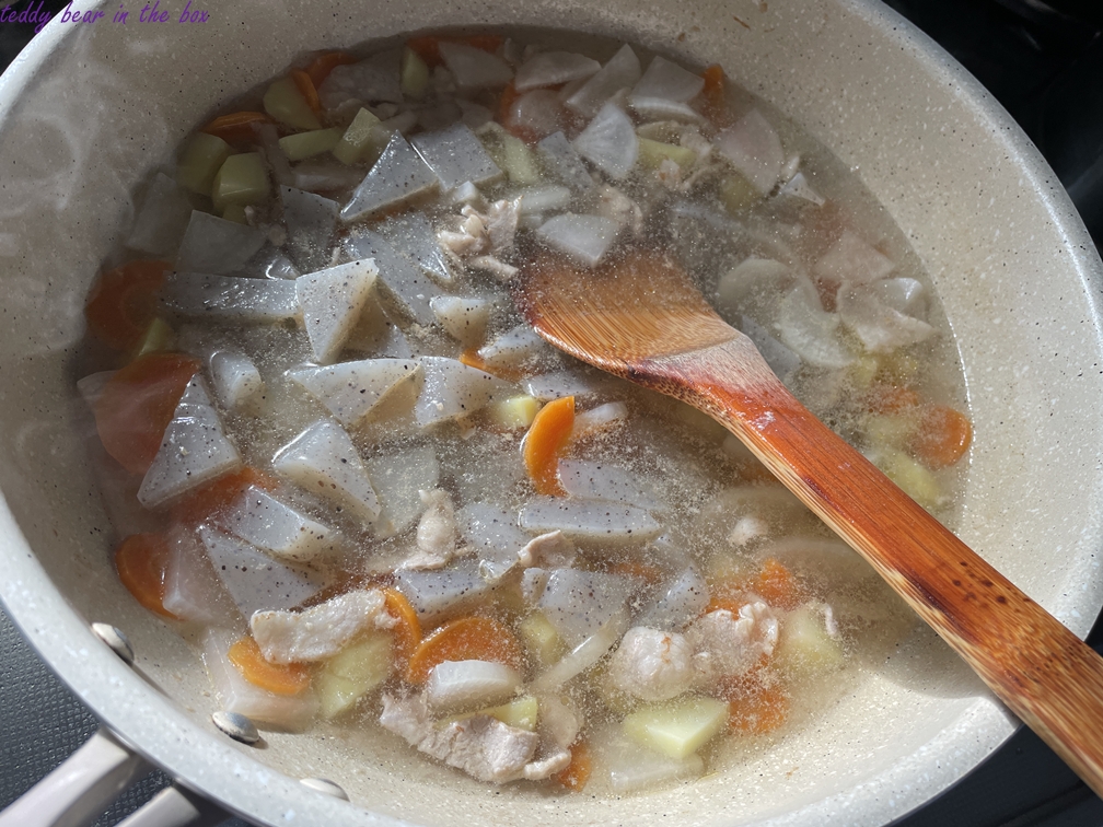 ใส่ผงปลาคัทสึโอะ ต้มจนมันฝรั่งนิ่ม