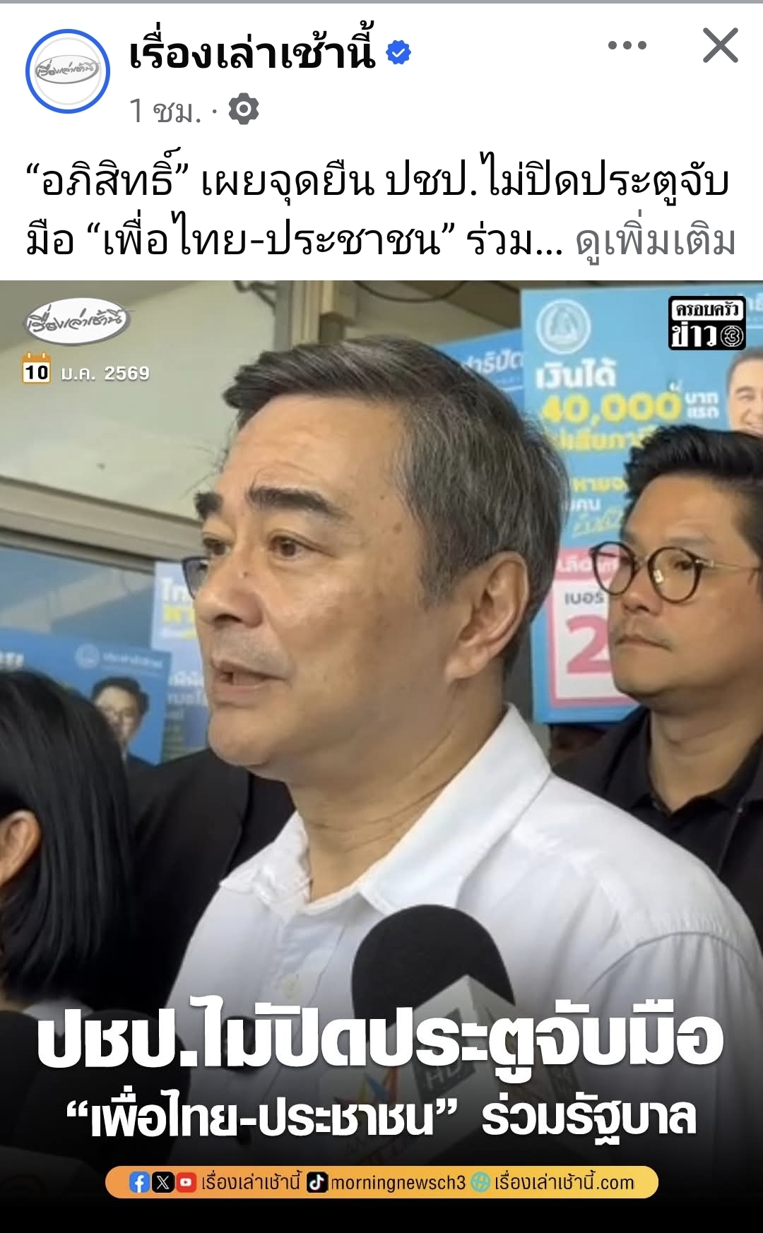 อภิสิทธิ์” ไม่ปิดประตูจับมือ “เพื่อไทย” กางเงื่อนไขร่วม รบ. ต้องสุจริต ไร้ทุนเทา เมื่อเวลา 10.55 น. วันที่ 10 มกราคม ที่ตลาดบองมาเช่ เขตจตุจักร กทม. นายอภิสิทธิ์ เวชชาชีวะ หัวหน้าพร
