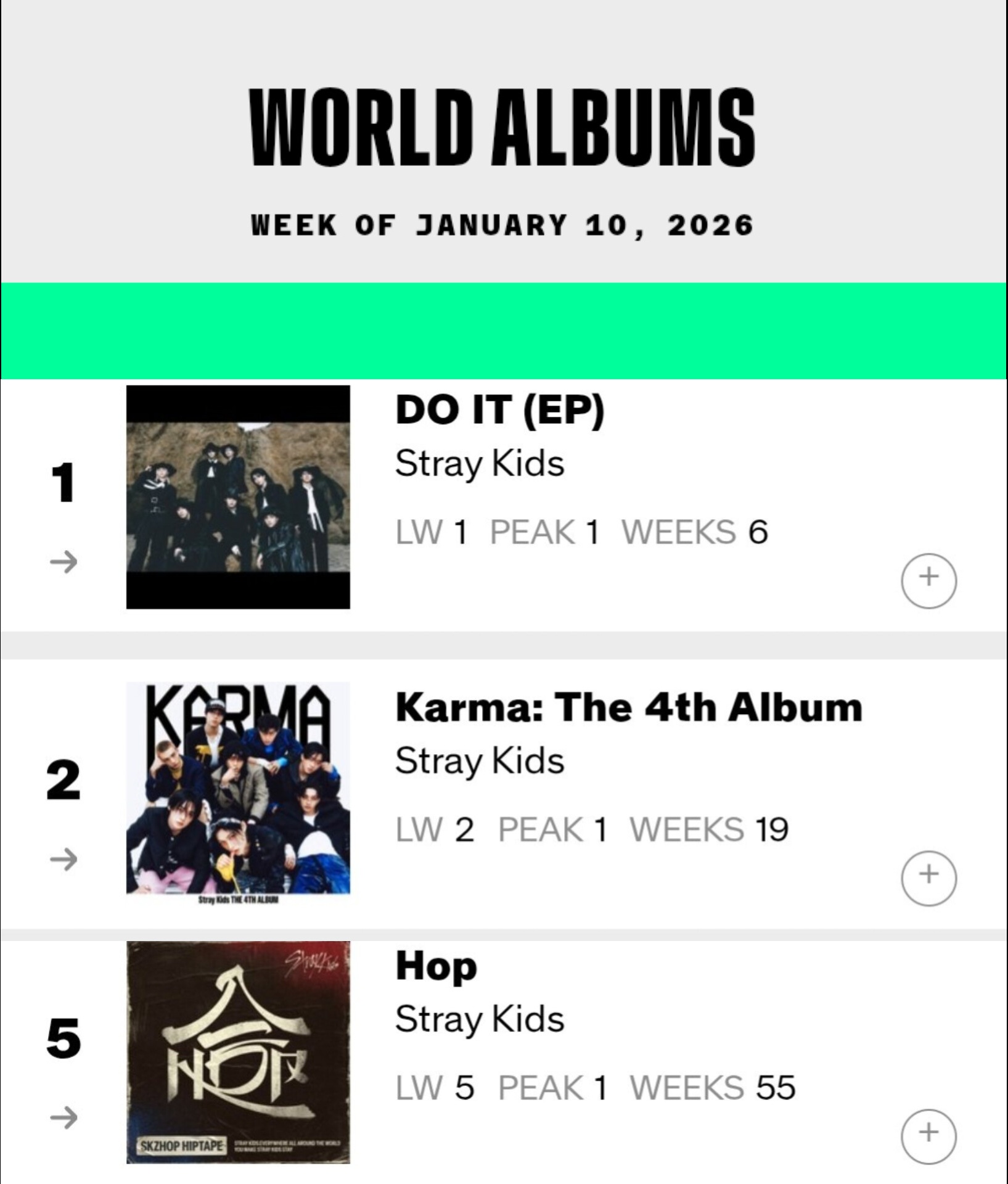 Stray Kids ครองอันดับ 1 และอันดับ 2 เต็ม ๆ และเป็นกลุ่ม K-Pop เพียงกลุ่มเดียวที่ส่งผลงานเก่า-ใหม่รวม 6 อัลบั้มติดชาร์ตพร้อมกันในสัปดาห์นี้ แสดงถึงพลังของ STAY ที่ยังคงสตรีมและซื้อต่อเนื่องแม้ผ่านมาหลายเดือนหลังปล่อย!