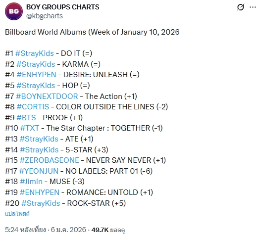 🔥 Stray Kids อัลบั้มอันดับ 1 อัลบั้มสุดท้ายของปี 2025 และอัลบั้มอันดับ 1 อัลบั้มแรกของปี 2026 บน Billboard World Albums