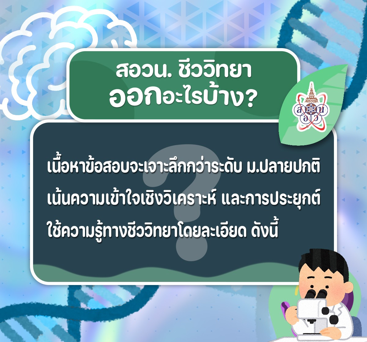 การสอบ สอวน. ชีววิทยา ไม่ได้วัดเพียงการจดจำเนื้อหา แต่เน้นความเข้าใจเชิงลึก การวิเคราะห์ และการประยุกต์ใช้ความรู้ทางชีววิทยาอย่างเป็นระบบ