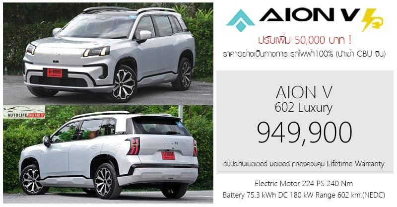 ปรับเพิ่ม 50,000 ! GAC AION V รถไฟฟ้า100% ราคาอย่างเป็นทางการ : 949,900 บาท