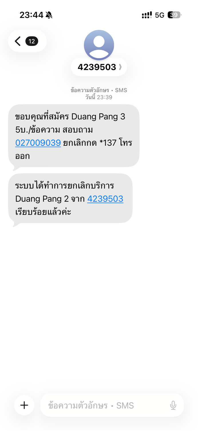 จู่ๆเมื่อ 9 มค 68 มีความส่งมาว่าขอบคุณที่สมัครดูดวง แต่เอ๊ะ เราไม่ได้สมัคร ไม่ได้คิดไร โดนไป 2 ข้อความ ไม่แน่ใจว่าข้อความละกี่บาท แต่ก็โทร *137 แล้วกดยกเลิกไปแล้ว แล้ววันนี้ 10 มค 68 มีอีกข้อความเข้ามาอีกว่าขอบคุณที่สมัครดูดวง