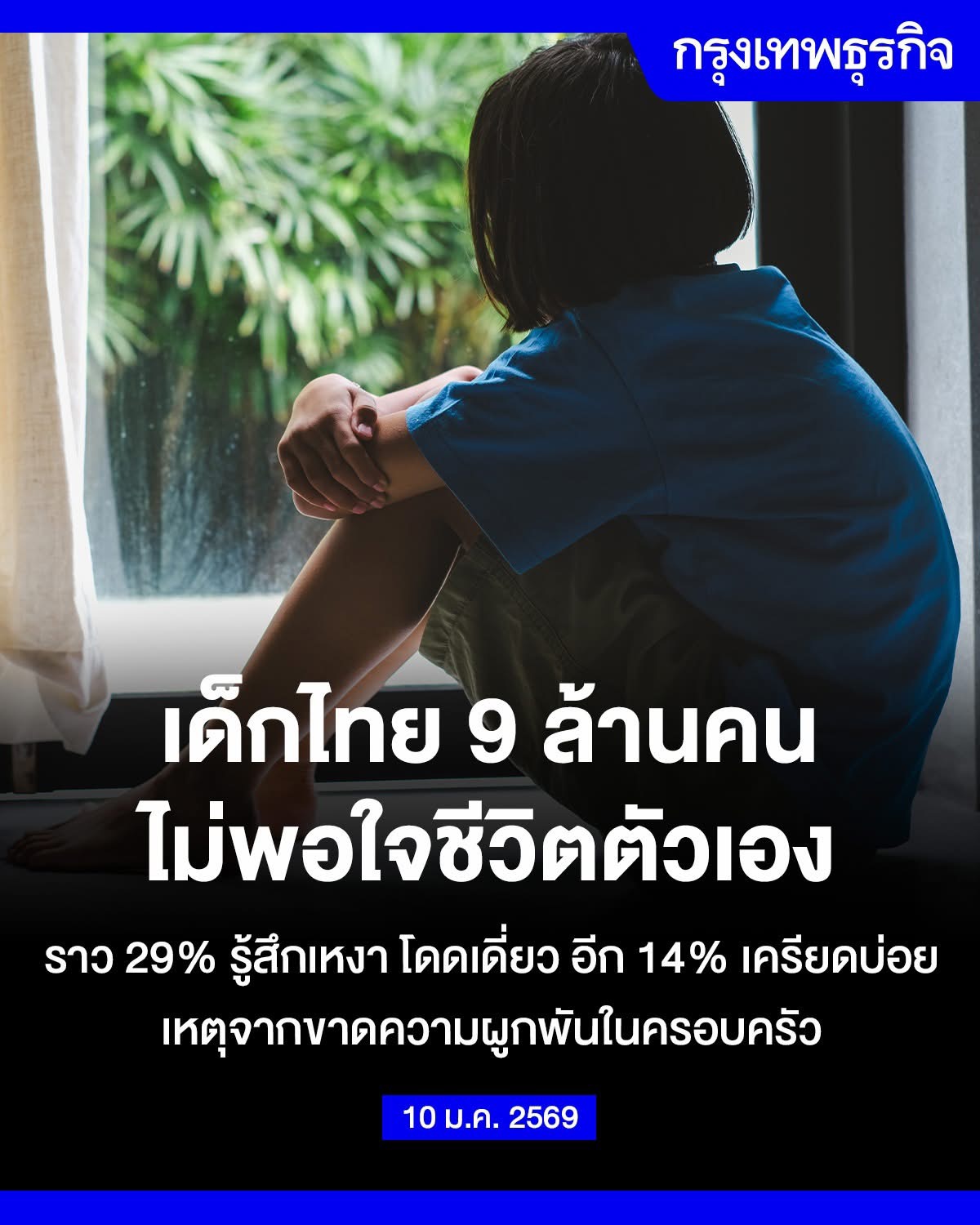 เด็กไทย 9 ล้านคน ไม่พอใจชีวิตตัวเอง ราว 29% รู้สึกเหงา โดดเดี่ยว อีก 14% เครียดบ่อย เหตุจากขาดความผูกพันในครอบครัว
