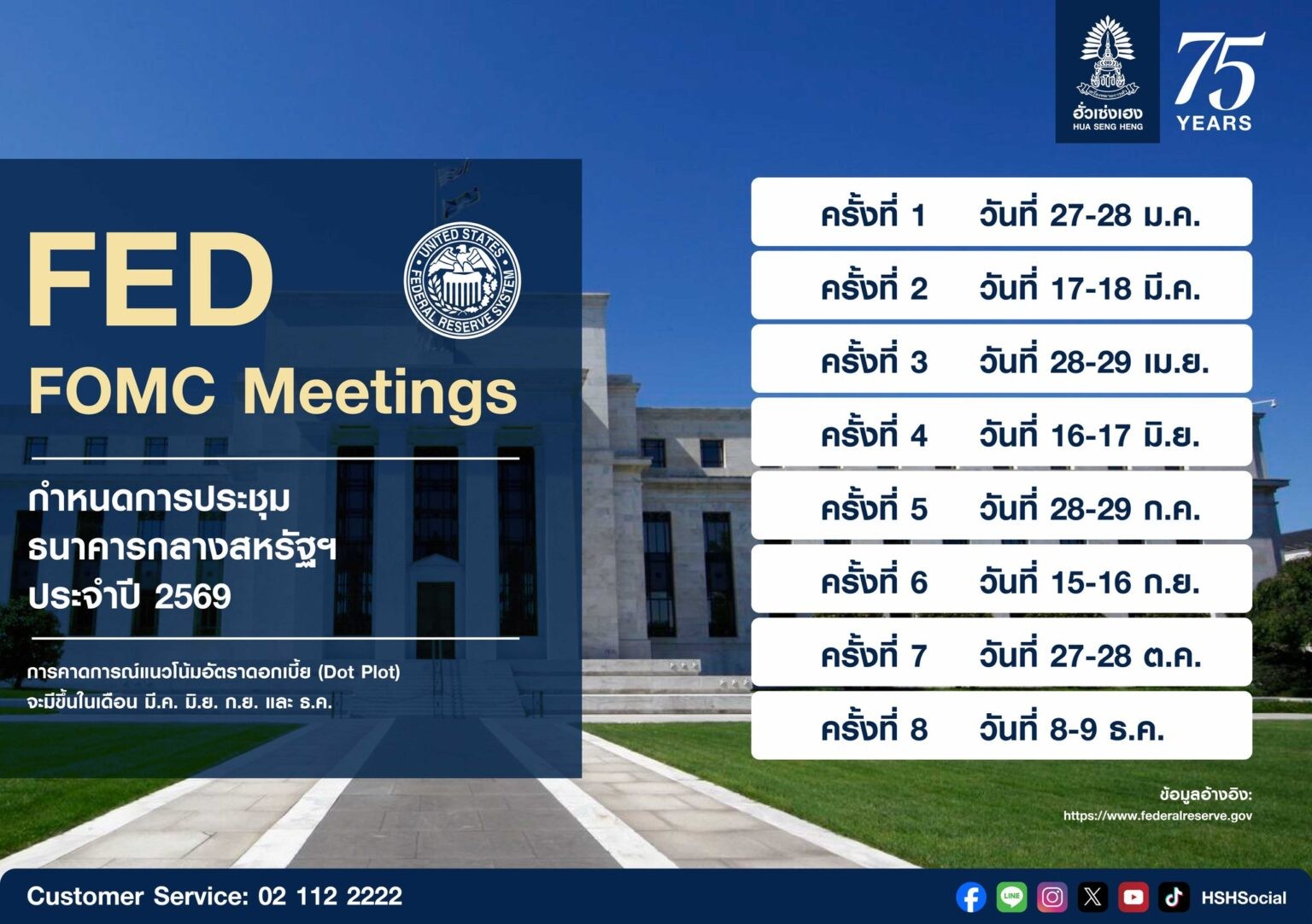 ฮั่วเซ่งเฮง อัพเดตกำหนดการประชุมธนาคารกลางสำคัญ ประจำปี 2569 หนึ่งในปัจจัยหลักที่ส่งผลต่อทิศทางตลาดการเงิน อัตราดอกเบี้ย และการลงทุนทั่วโลก