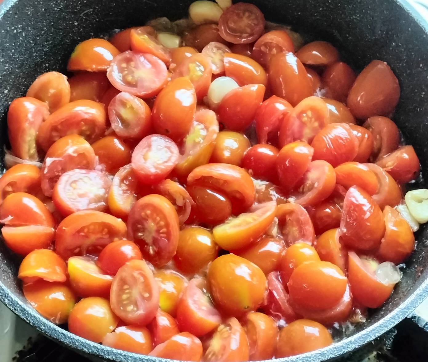 ตีไข่แล้วใส่ลงกระทะตอนมะเขือเทศสุกนุ่ม