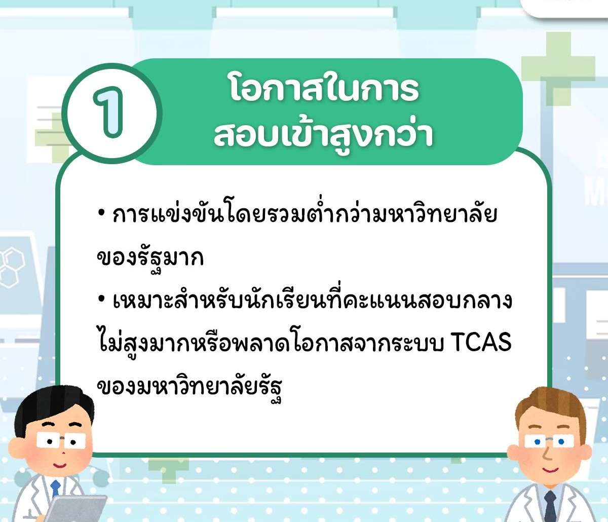 • เกณฑ์การรับสมัครที่ยืดหยุ่น: เหมาะกับนักเรียนที่อาจจะพลาดหวังจากรอบกสพท. หรือคะแนนสอบกลางไม่สูงมาก แต่มีศักยภาพ