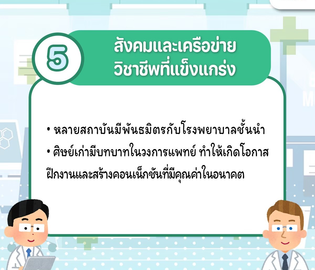• อิสระในเส้นทางอาชีพ: ข้อกำหนดเรื่องการใช้ทุนที่น้อยกว่า ทำให้สามารถเลือกเส้นทางชีวิต หรือเรียนต่อเฉพาะทางได้เร็วกว่าเพื่อนรุ่นเดียวกัน