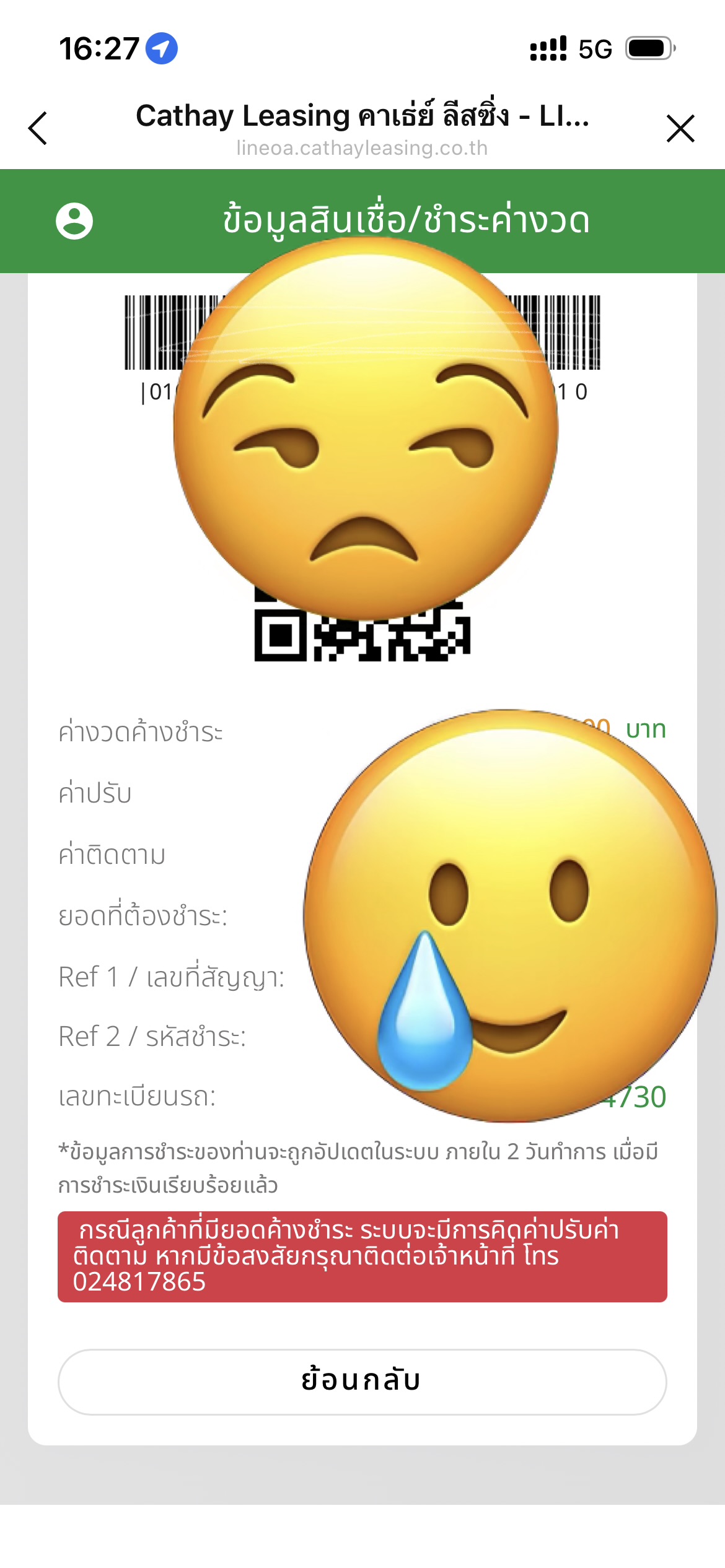แต่ไม่ปรับยอดให้ แถมขึ้นตัวแดงว่าค้างชำระ เสียค่าปรับอีก ติดต่ออะไรก็ไม่ได้ โทรเบอร์สำนักงาน 2 เครื่อง พร้อมกัน รอเปนชั่วโมง ก็ไม่รับเลย ระบบอัตโนมัติ ติดต่อเจ้าหน้าที่ รอนานมาก ไม่มีคนรับ จะติดต่อทางไหนได้บ้าง บริบัท คาเธ่ย์ ลิสซิ่ง